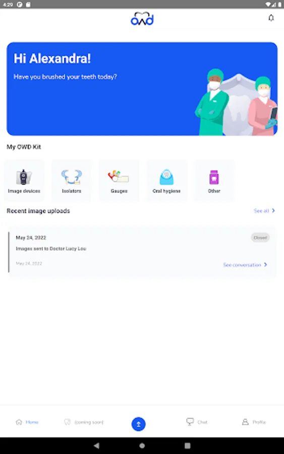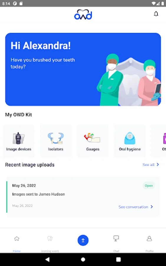 Open Wide Dentist (OWD) is a service which allows you to communicate with your dentist by sending images taken with an "OWD Kit" - a set of devices which lets you take high-quality dental images using your phone.