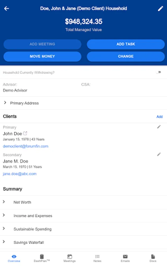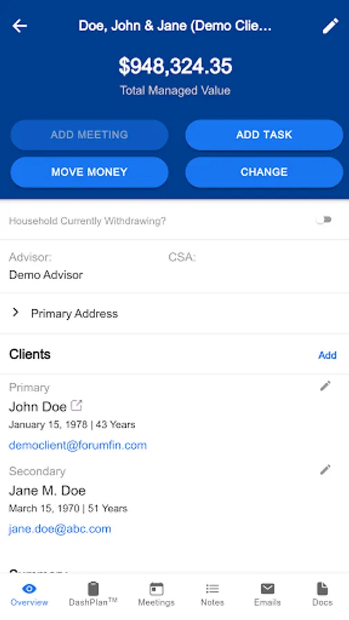 • Access client households to view contact information, confirm meeting schedules and reference account balances and total household assets under management