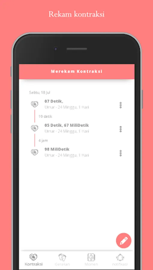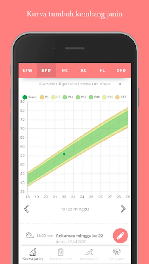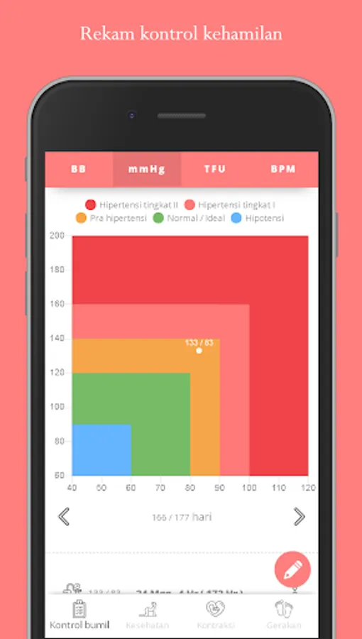 pregnancy control with features of recording maternal weight per week, recording blood pressure per day, recording fetal heart rate per week, and also being able to monitor such as pregnant women's health records, counting baby movements in the womb and also pregnancy contractions.