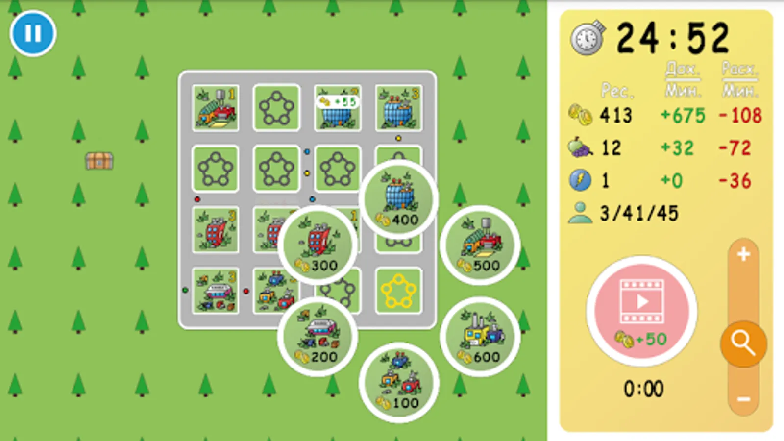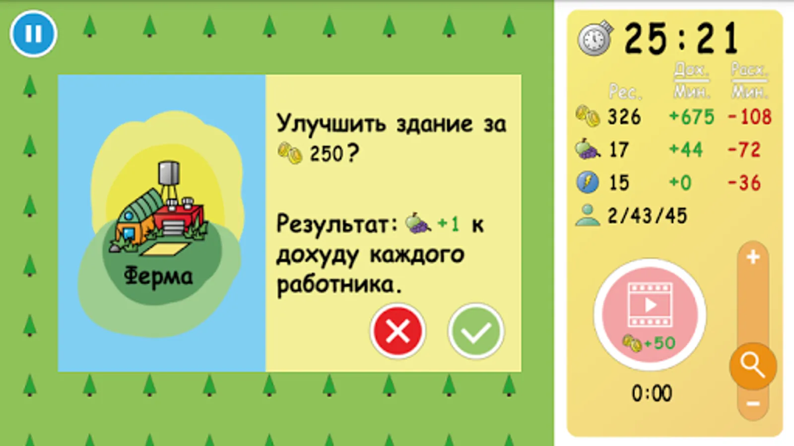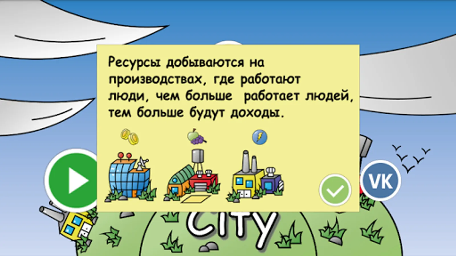In the beginning you will have a small start-up capital, which need to properly dispose of the initial stage of development of the city! Logical sequence of construction of buildings in the city and improve the help to avoid bankruptcy and the city will bring success, earning money and resources. The availability of money, resources and houses will attract new people and the proper distribution of the people for the production of guaranteed income and success!