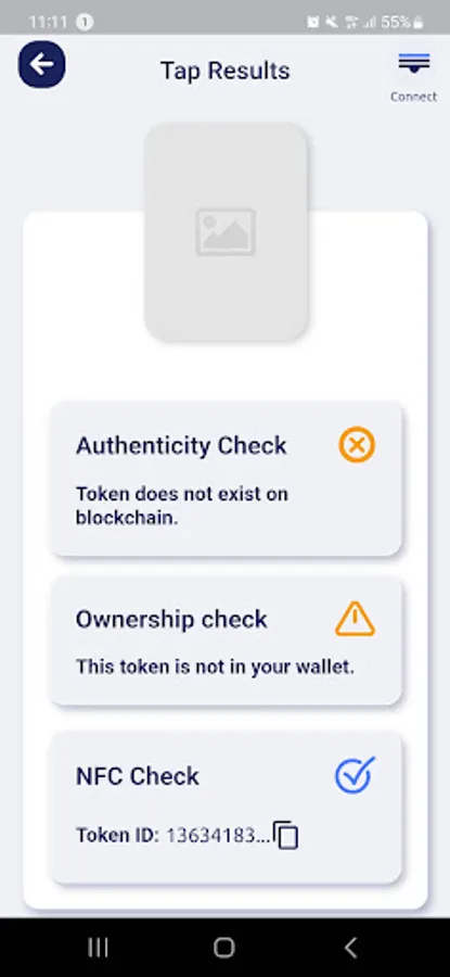 3. Ownership verification: Users can scan an already initialized chip, then the corresponding NFT is searched in the connected wallet and the ownership is confirmed.
