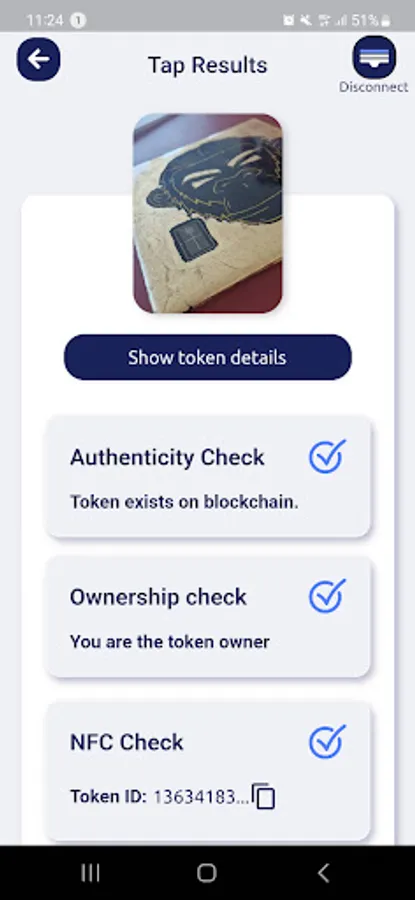 2. Authentication: Users can scan an already initialized chip, the metadata of the authenticity token will then be searched for and displayed.