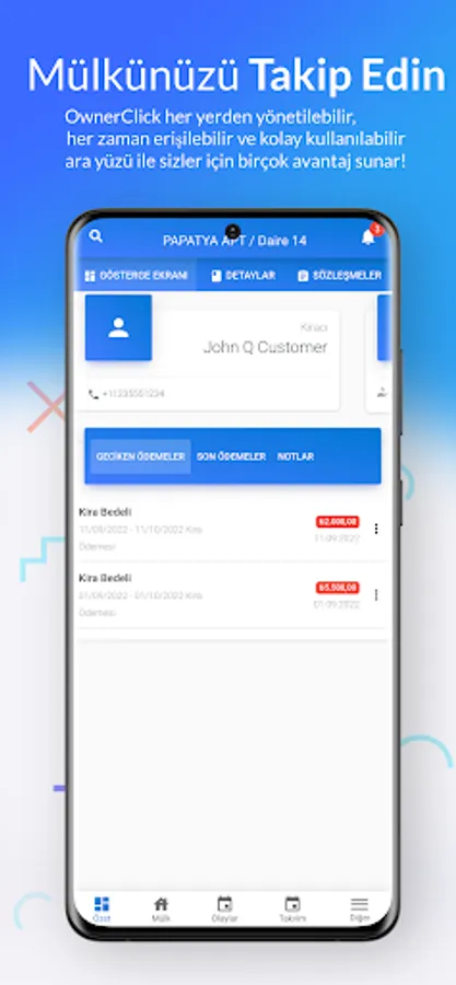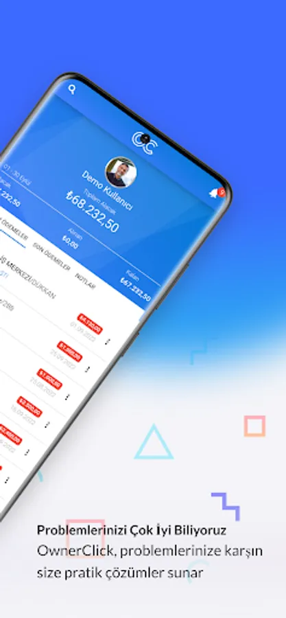 OwnerClick; kiraların kredi kartı ve bir çok banka entegrasyonu ile Tahsilatı, Akıllı Gelir-Gider Takibi, Otomatik Sözleşme Oluşturma ve Uzatma, Belge ve Doküman Takibi, Demirbaş Yönetimi, Onarım ve Hukuk Süreçleri Takibi gibi modüller ile mülk ve kira yönetimini parmaklarınızın ucuna getiren akıllı ve kolay kullanımlı bir uygulamadır.