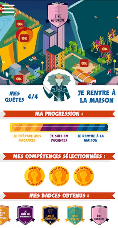 When you return from vacation, after completing all your quests, get a badge for each skill.