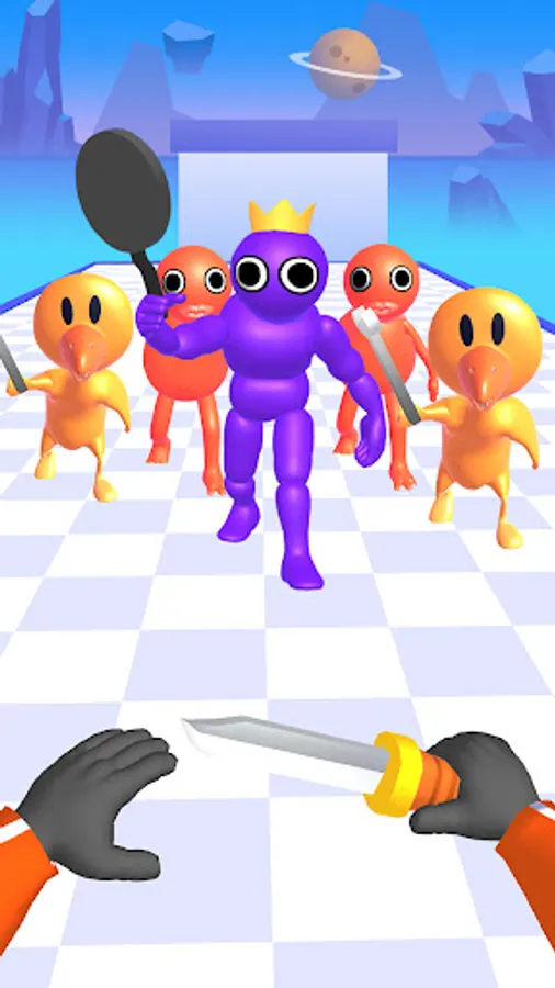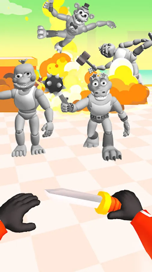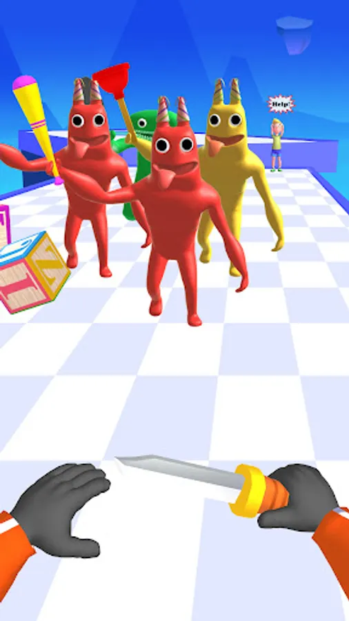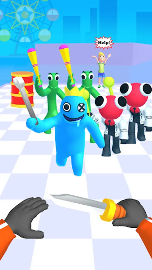Pick up a weapon and defeat them quietly by throwing them. Be careful of "Rainbow Friends", "BanBan", "Freddy", and more people will come out.