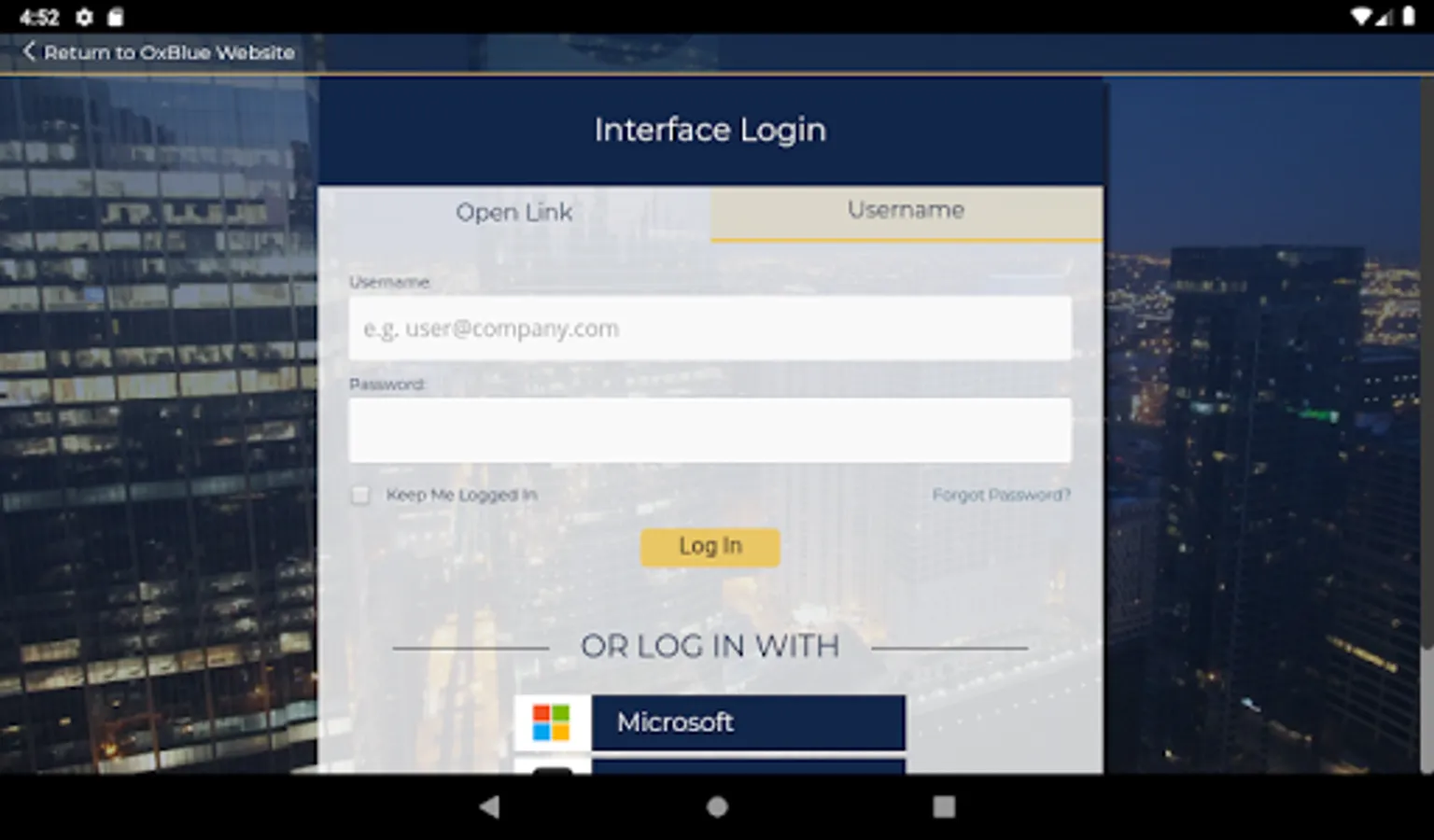 To begin, install the application then enter your username/password or OxBlue Open link for your camera.