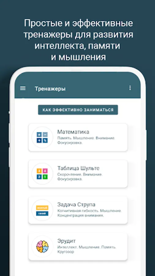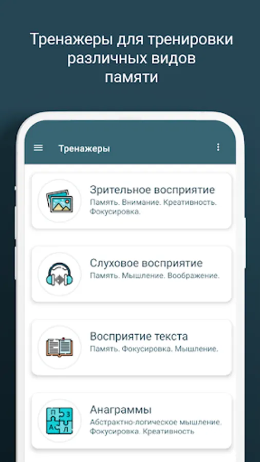 In addition to memory simulators, the app has a library of educational articles on memory development, health, personal growth and longevity.