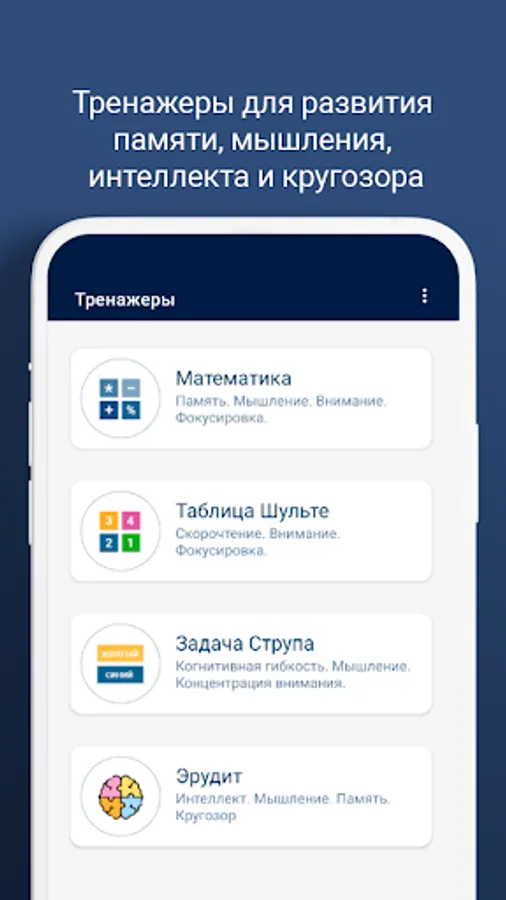 Our memory and mind development app consists of 2 sections: