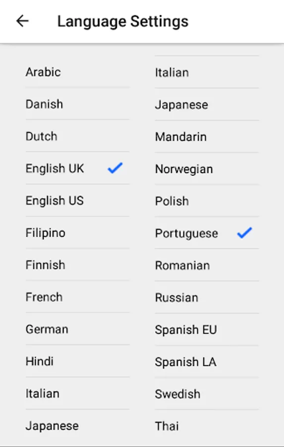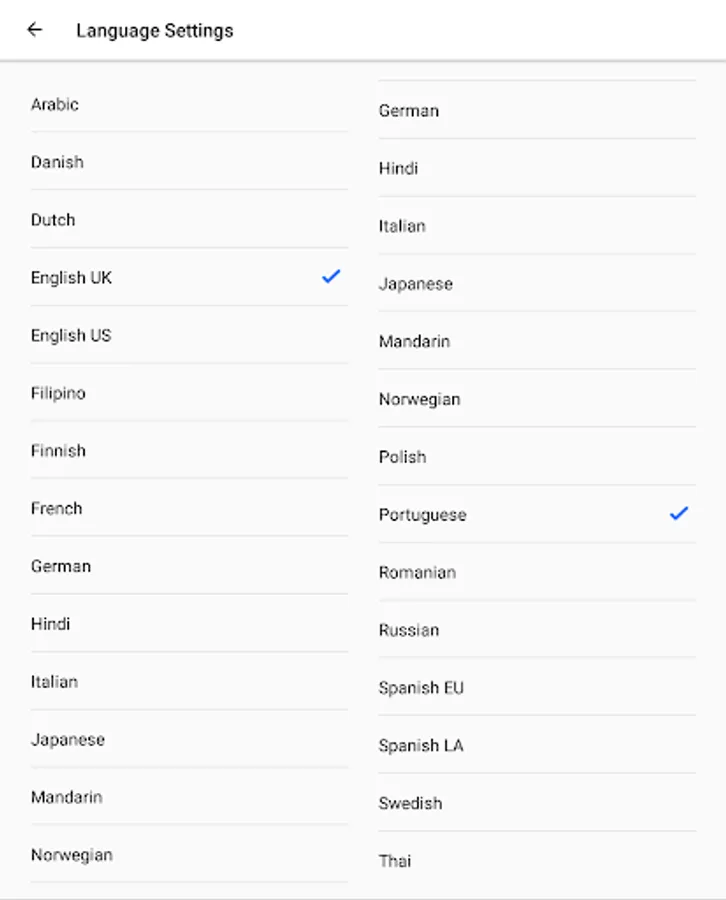 Languages currently available: English, Spanish, Arabic, Danish, Dutch, Filipino, Finnish, French, German, Hindi, Italian, Japanese, Mandarin, Norwegian, Polish, Portuguese (European), Romanian, Russian, Swedish, and Thai. More languages to come soon!