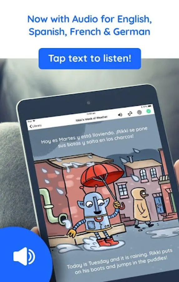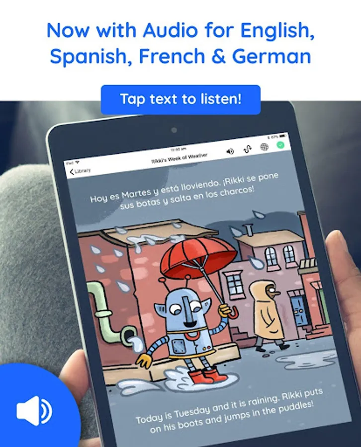 Professional audio narration is available in English, Spanish, French, German, Italian and Mandarin, with more languages to follow. Just tap on the text to hear it spoken by a native speaker. The audio quality is excellent and will help you with your pronunciation!