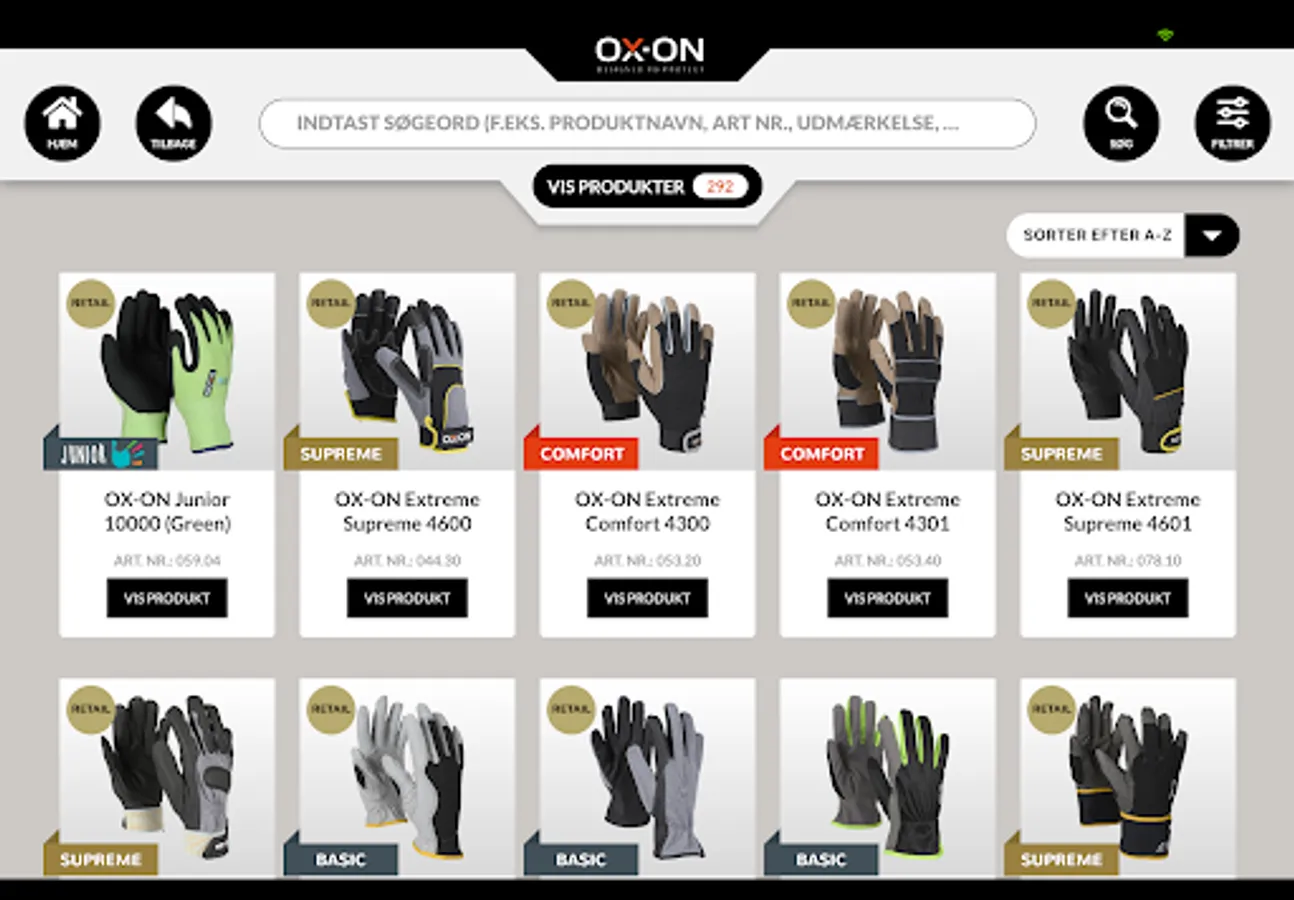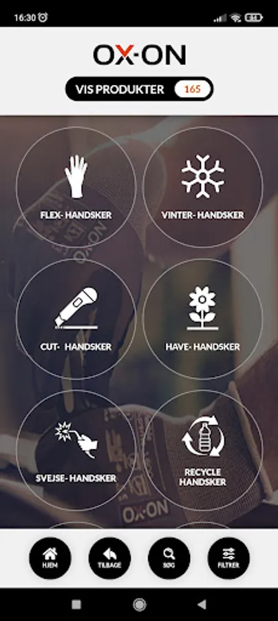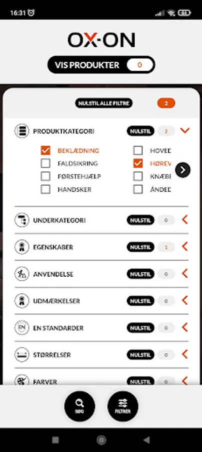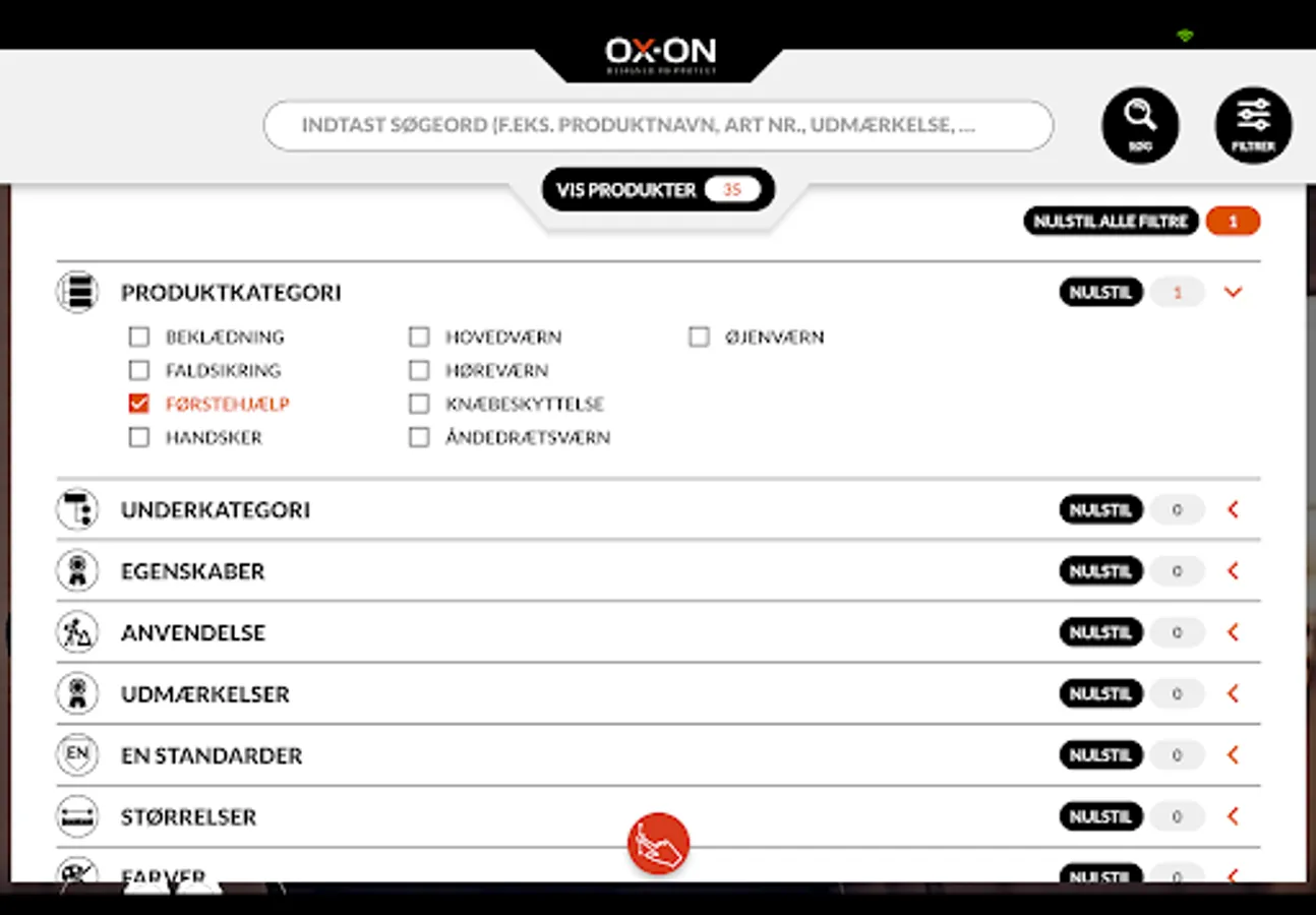 I OX-ON App'en kan du både søge, filtrere eller guide dig hen til anbefalede produkter ved at angive nogle ønsket udvælgelseskriterier i App’en. Kriterierne kan være f.eks. arbejdsområder, anvendelser, brancher, produktfeatures, udmærkelser, funktioner, EN standarder, materialer, etc.