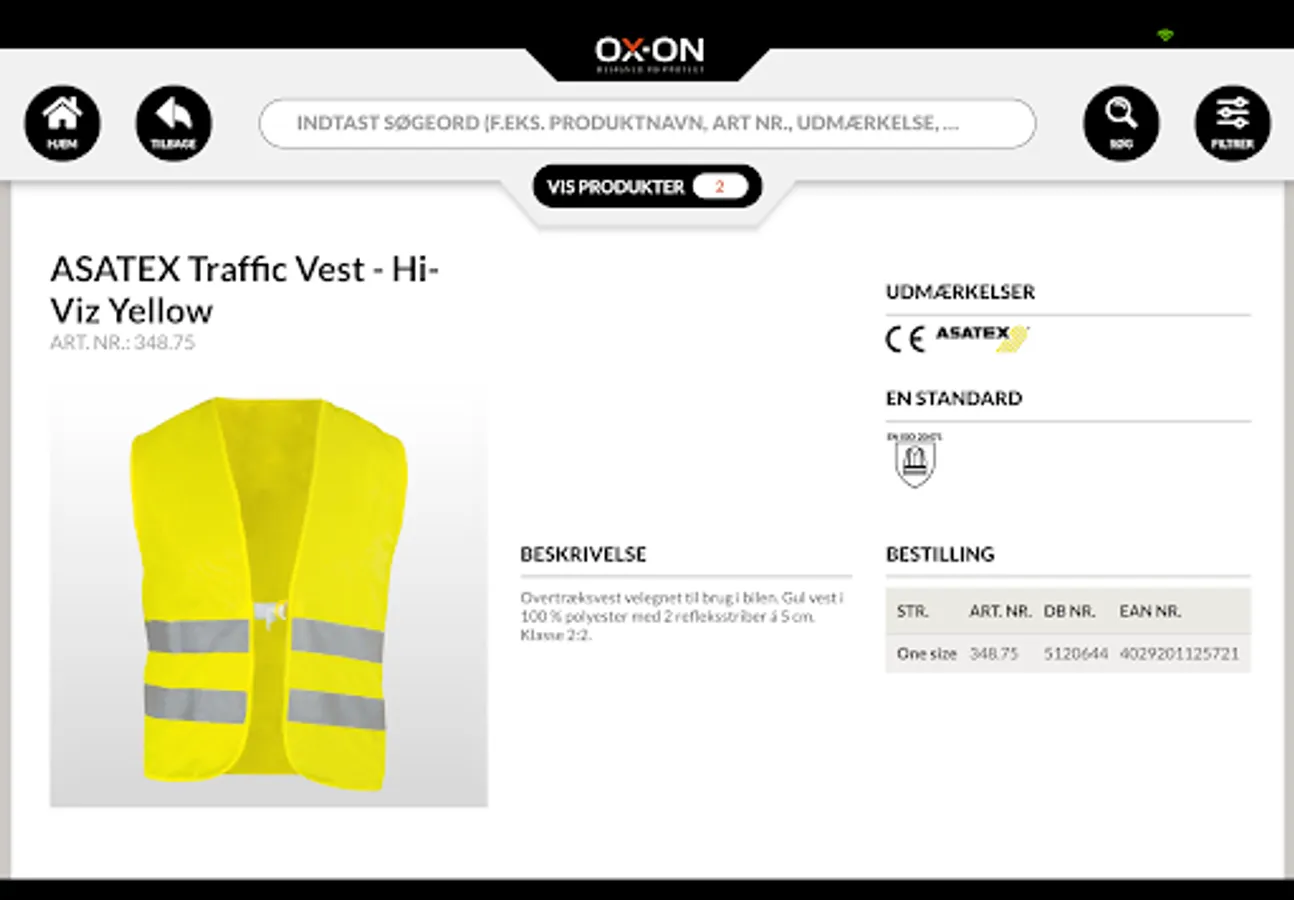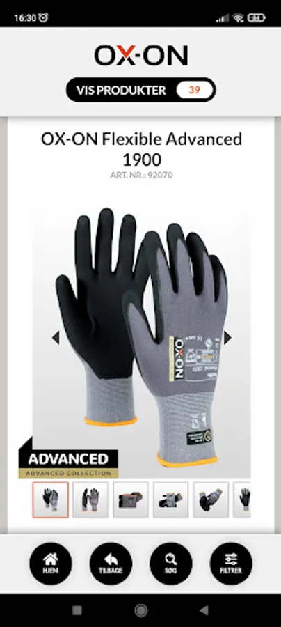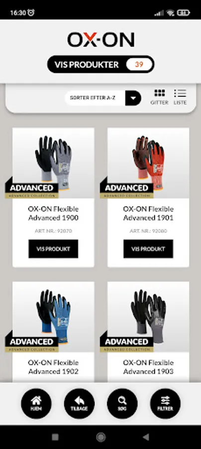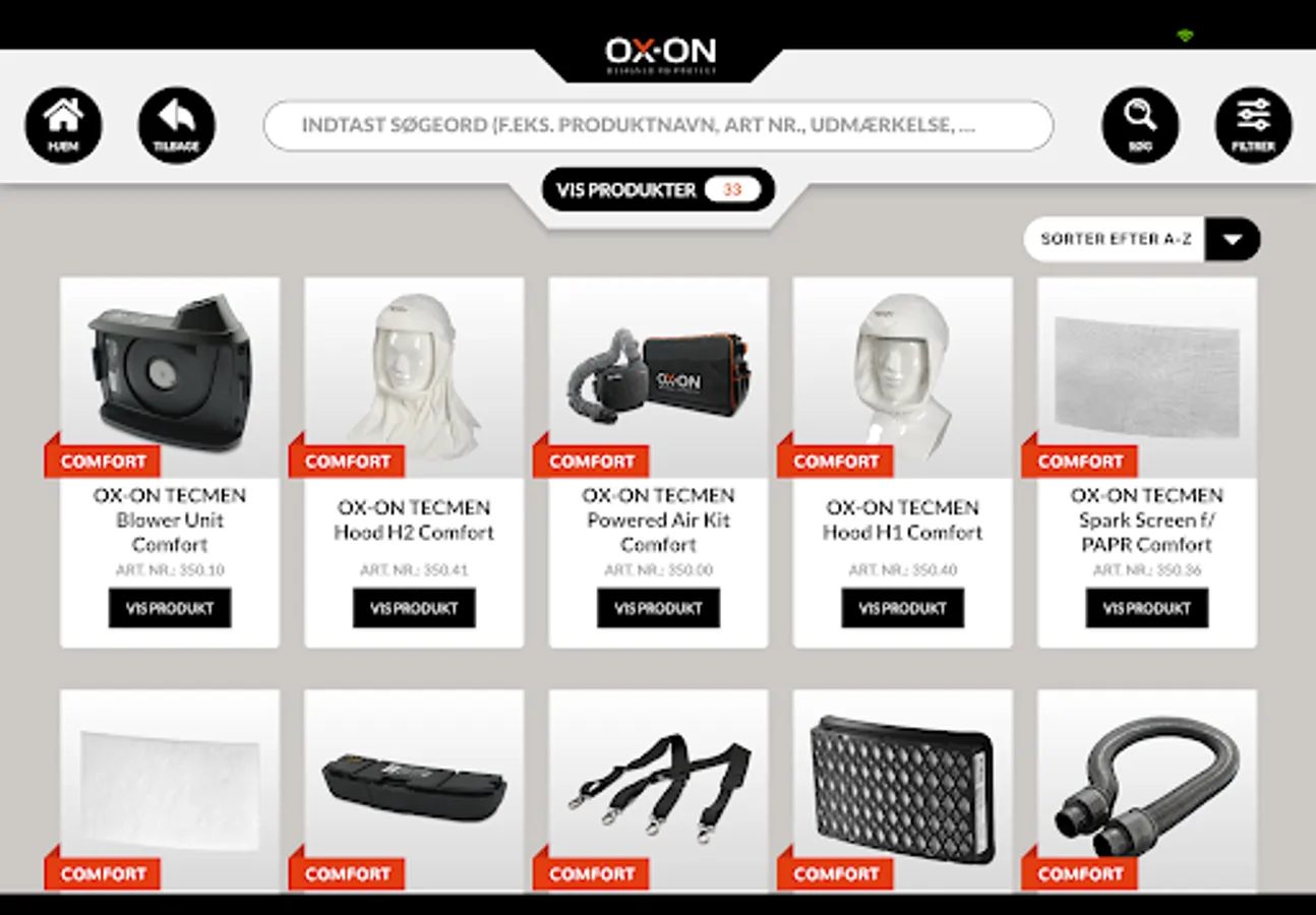I OX-ON App'en kan du både søge, filtrere eller guide dig hen til anbefalede produkter ved at angive nogle ønsket udvælgelseskriterier i App’en. Kriterierne kan være f.eks. arbejdsområder, anvendelser, brancher, produktfeatures, udmærkelser, funktioner, EN standarder, materialer, etc.