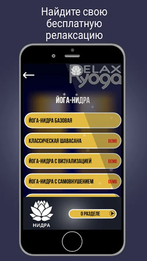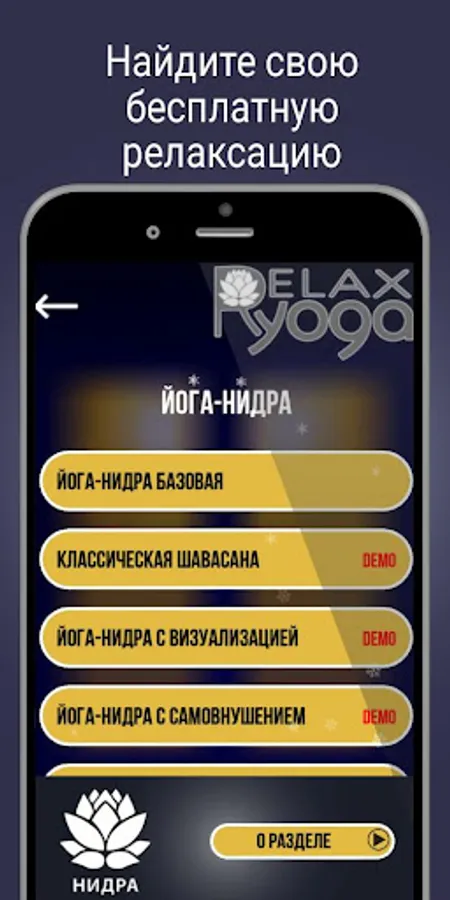 I. Section "YOGA-NIDRA SAVASANA" promotes deep mental relaxation and calm sleep. Includes: progressive relaxation, which is worth starting to master relaxation; various versions of Yoga Nidra and the classic Savasana yoga. The value of this section is "Yoga Nidra with Self-Suggestion of Positive Attitudes".