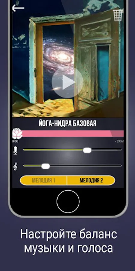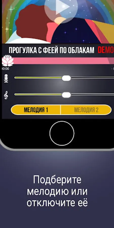 You can listen to relaxations, both with and without musical accompaniment, with the ability to select a melody and adjust the volume. Melody number 2 is more suitable for deep relaxation and sleep.