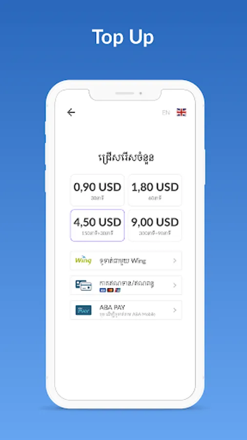 Top up your account with as little as $ 0.90 using Wing, ABA or Visa / Mastercard