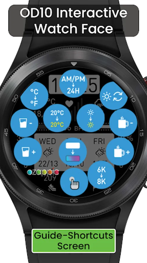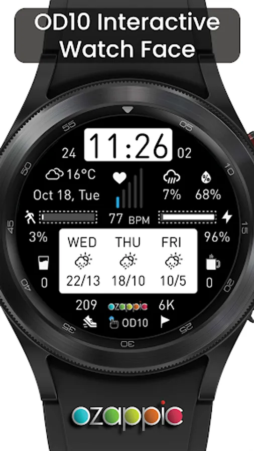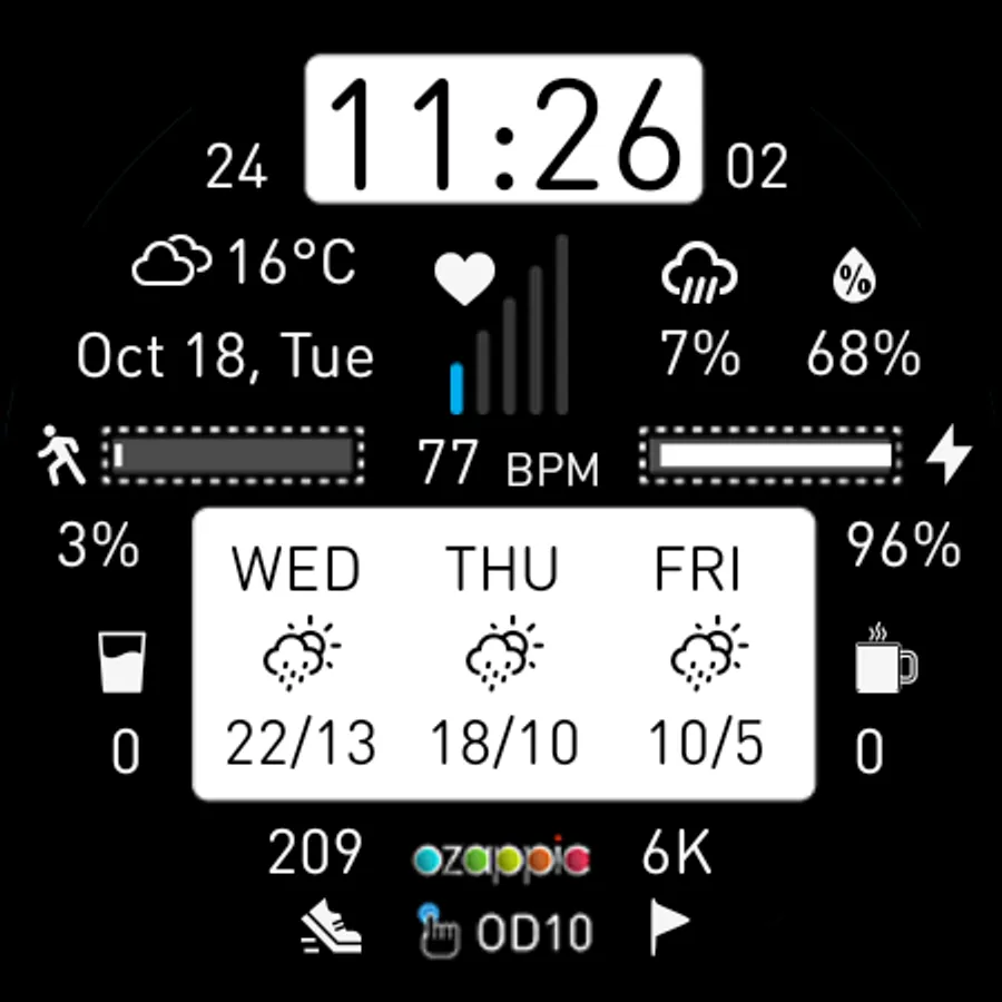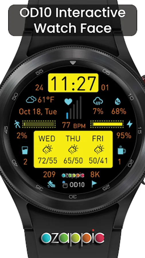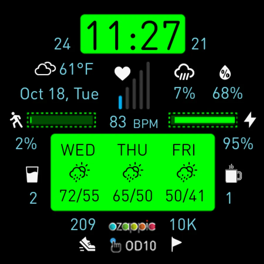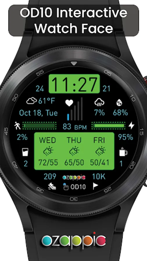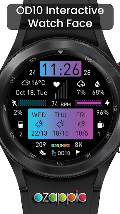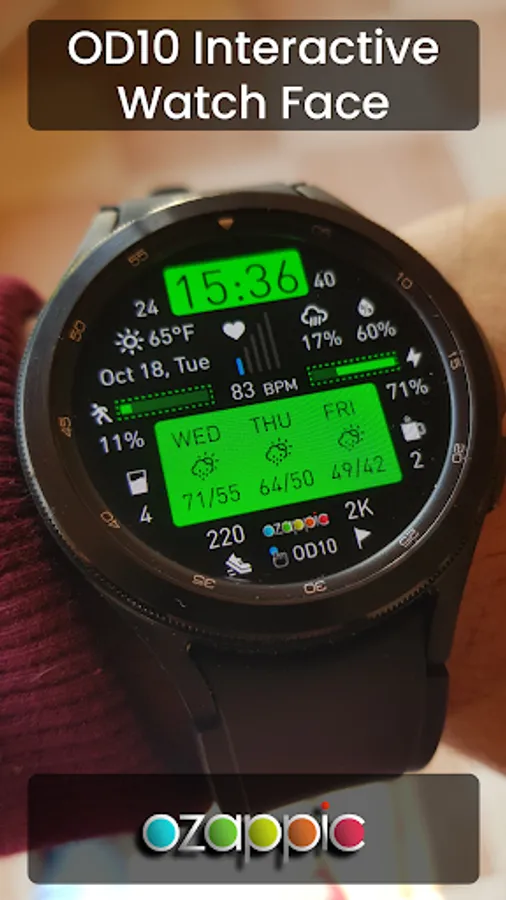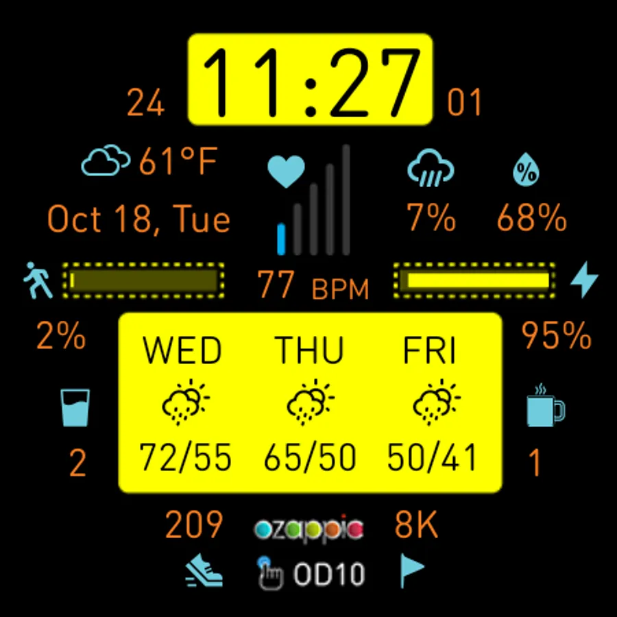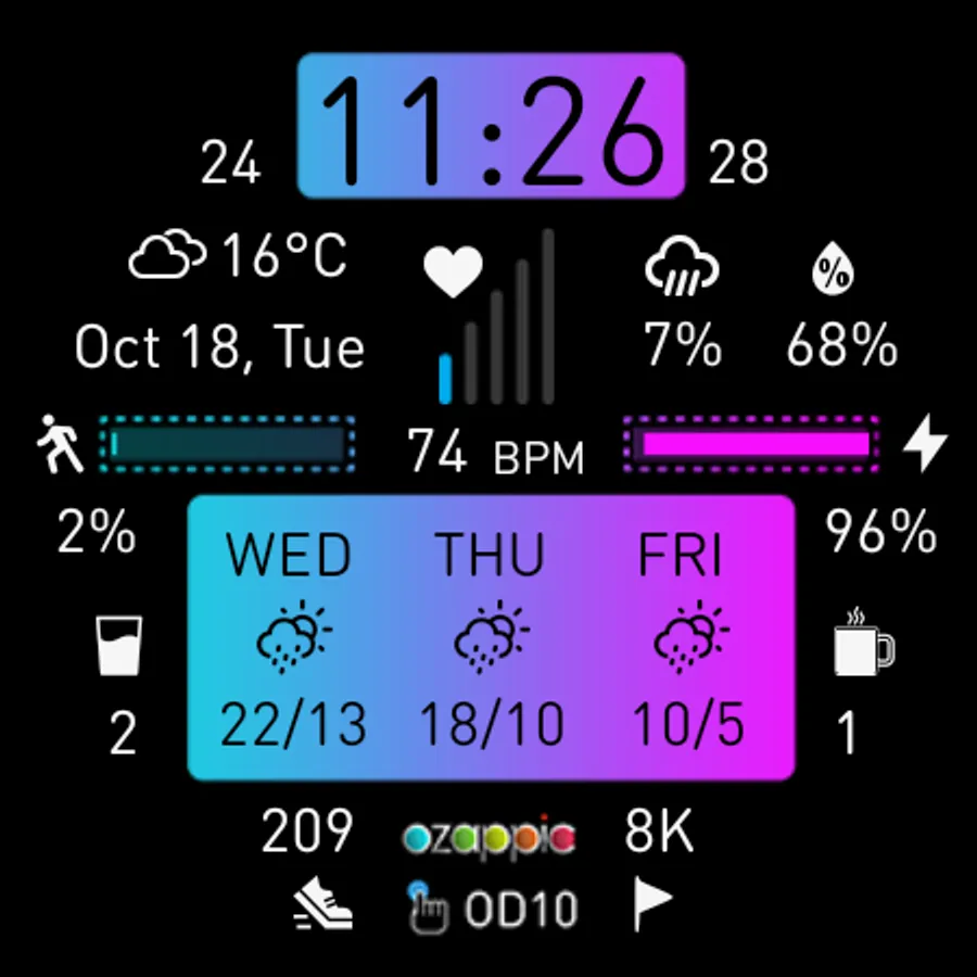 OD10 Interactive is a unique, informative, and colorful watch face full of data.