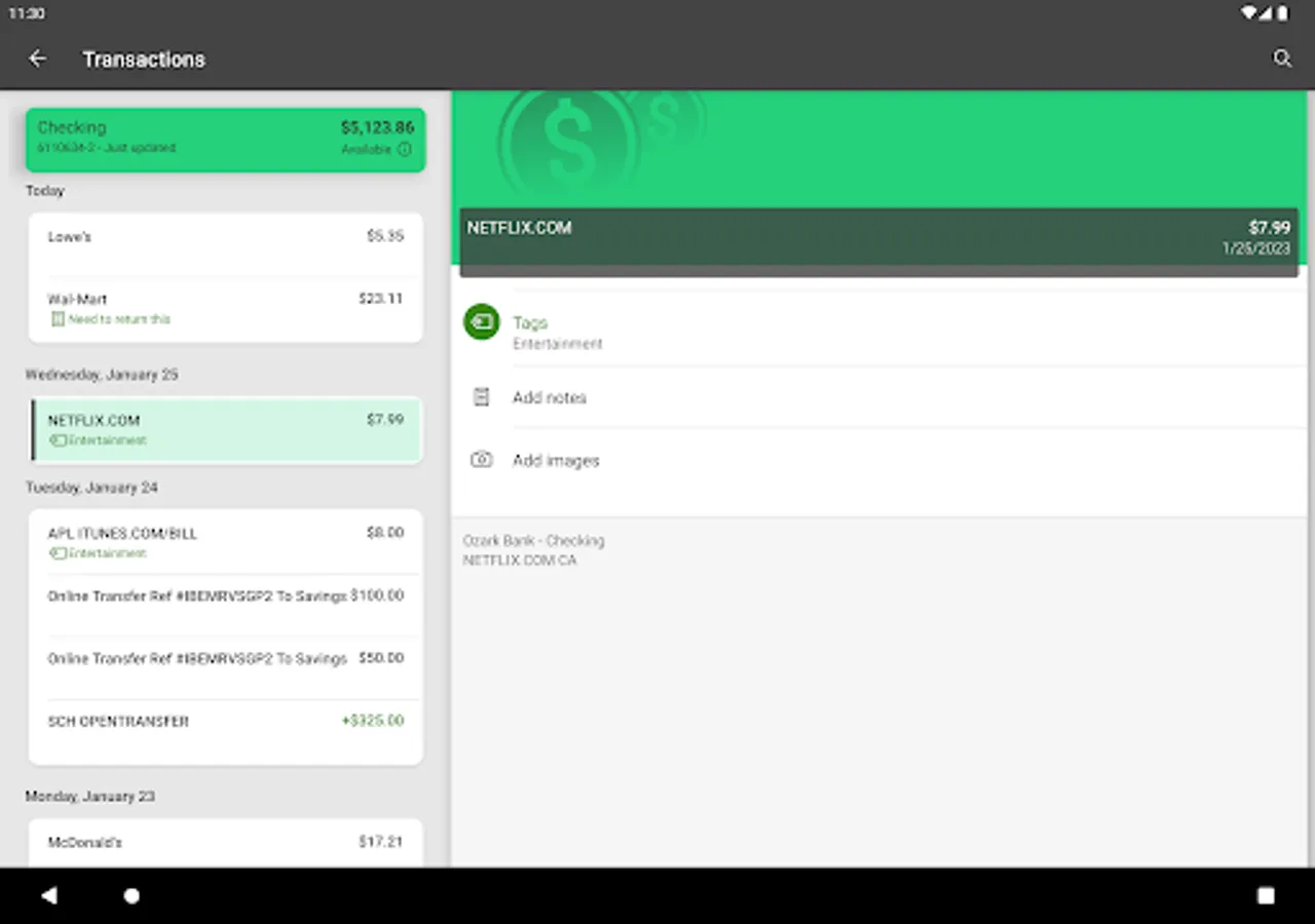 Keep your transactions organized by allowing you to add tags, notes, and photos of receipts and checks.