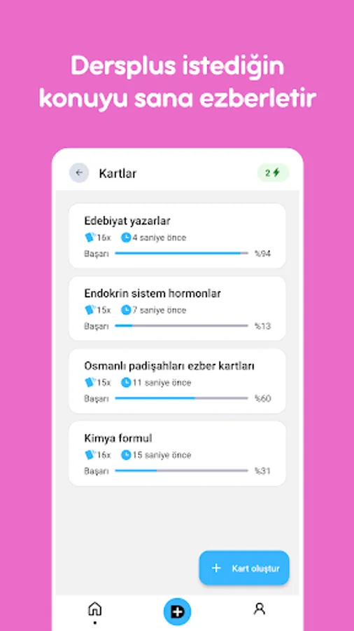 🃏 Cards: Quickly create your own customized cards with Dersplus. You can enter your study notes, then quickly review them with these cards. Dersplus makes learning organized and fun.