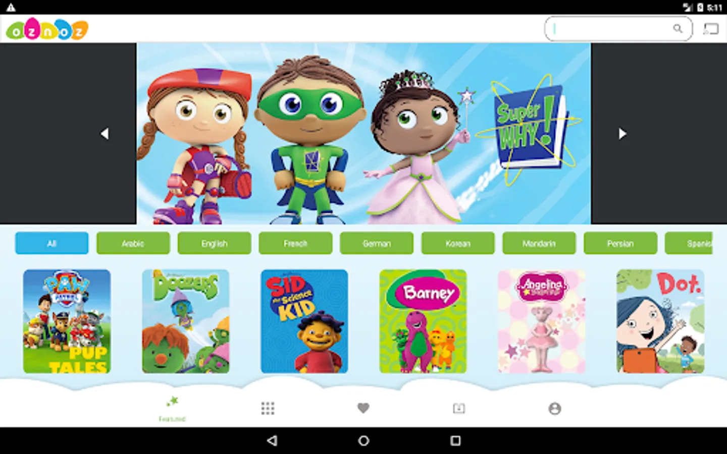 Oznoz features thousands of videos from around the world in English, French, Spanish, German, Arabic, Mandarin Chinese, Persian, and Korean that will immerse your child in a new language, teach social and emotional skills, and provide hours of fun!