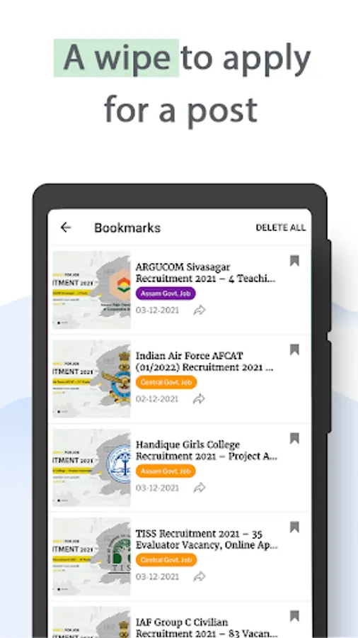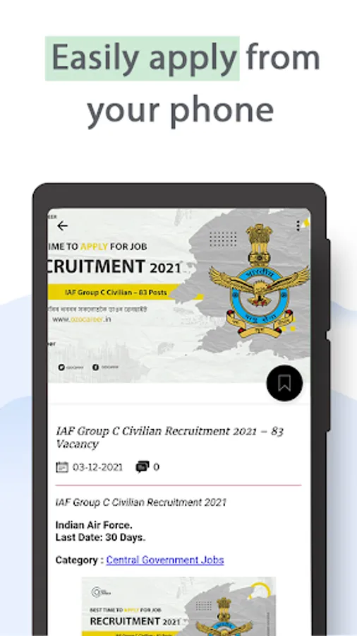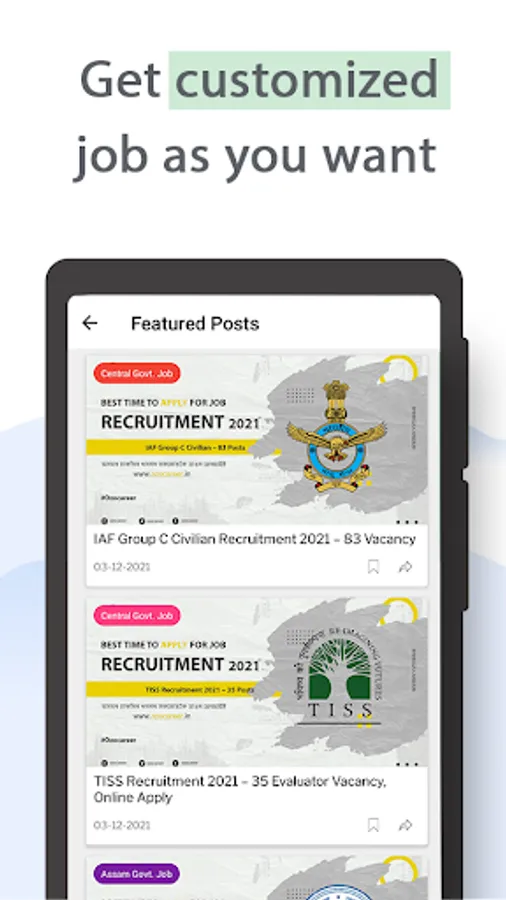 It helps freshers and experienced govt job seekers to search the most relevant government jobs with absolute ease even on the move. This application has also incorporated the latest govt job updates for all Bank jobs, IBPS, Railway jobs, SSC recruitment, Engineering jobs, UPSC recruitment, Defense jobs, Police jobs, Indian Navy, Indian Army, government universities and other government jobs across the nation.