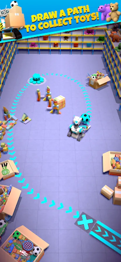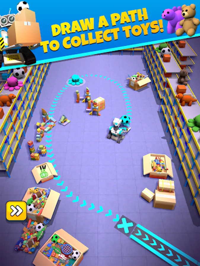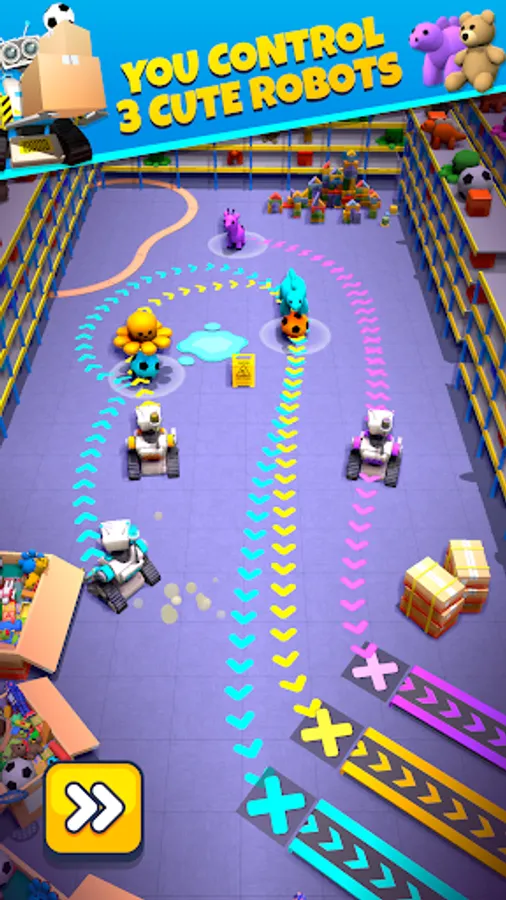 Plot the route for up to 3 robot cleaners picking up fallen toys, dodging hazards and avoiding crashing into other robots and shelves with calamitous results!