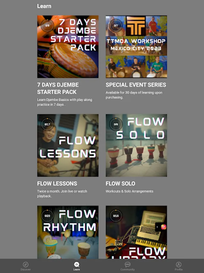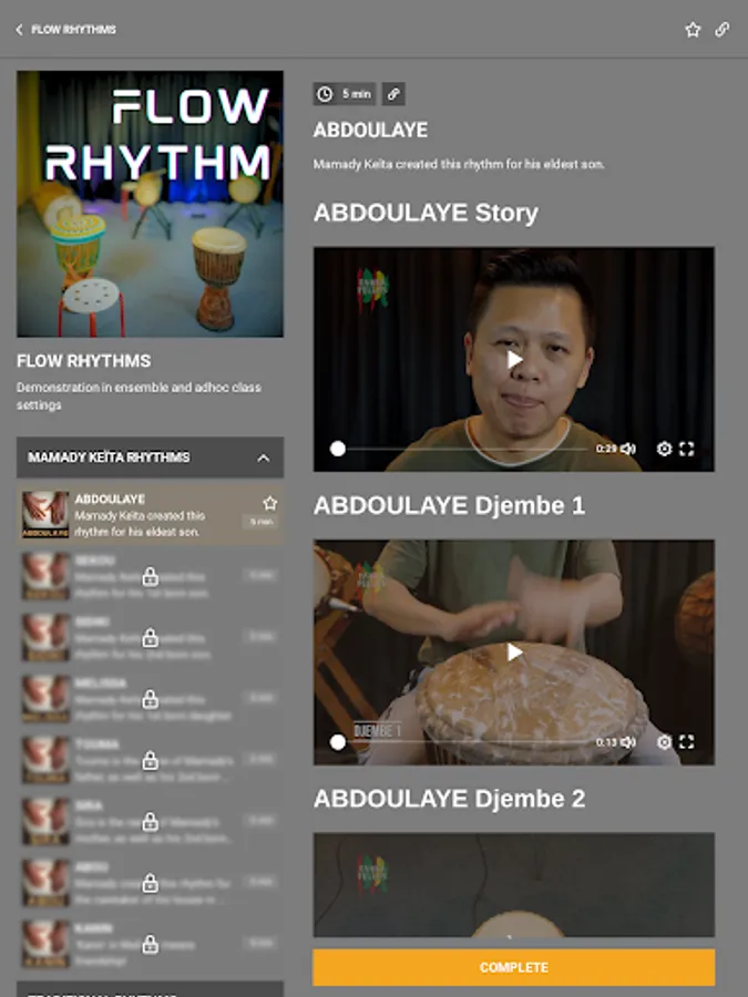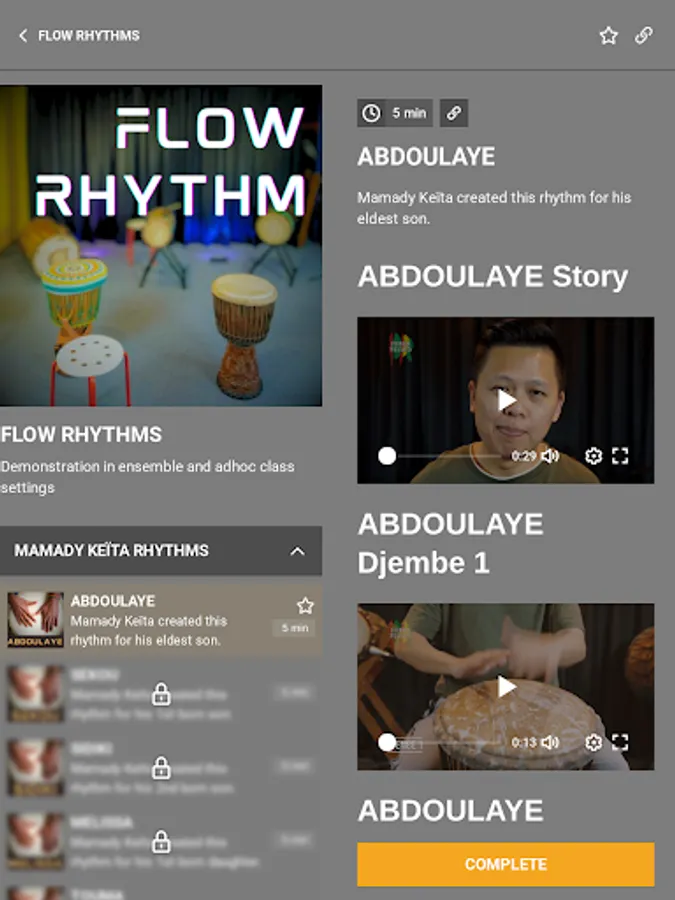 - FLOW LIBRARY (Audio playlists for djembe practice).