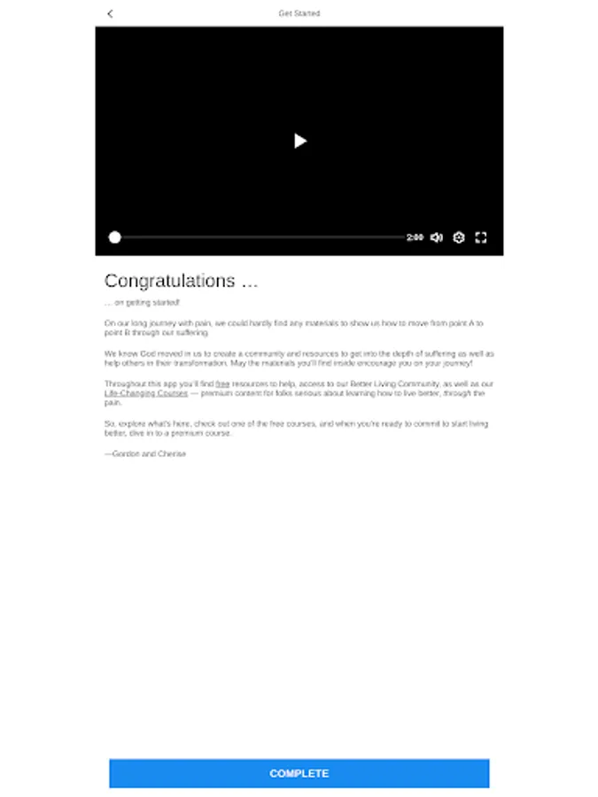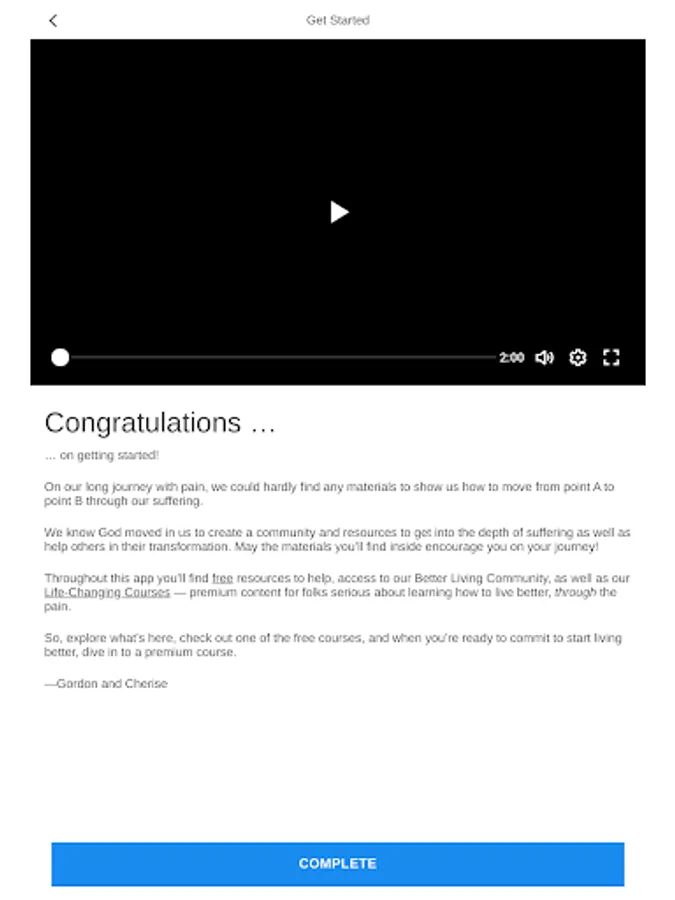 Inspired by experience and scripture, the video courses you'll find in this app are comprehensive and can be life-changing for those people ready for real change. These courses take viewers on a step-by-step process toward better emotional and spiritual lives. This app also provides access to Gordon & Cherise's Better Living Community, with lots of original content, helpful tips, guidance and participation by other members of the community, as well as free access to many of the weekly podcast episodes of the Gordon & Cherise Show.