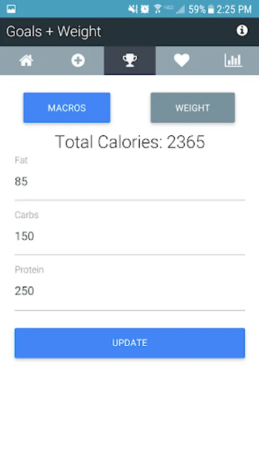 Set your macro goals, track your weight and add to your food log to keep your fitness and nutrition goals in check.