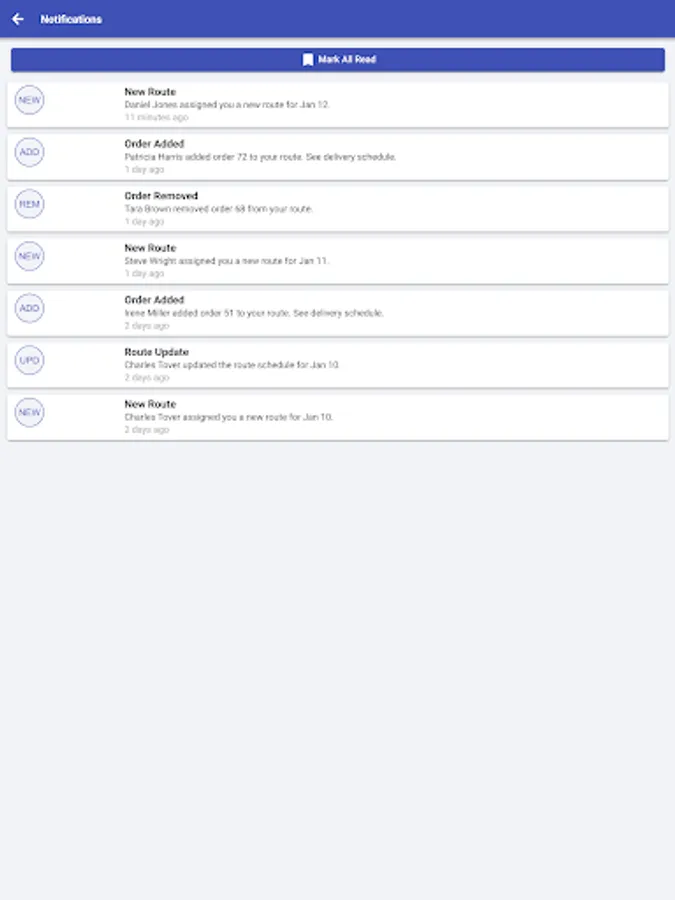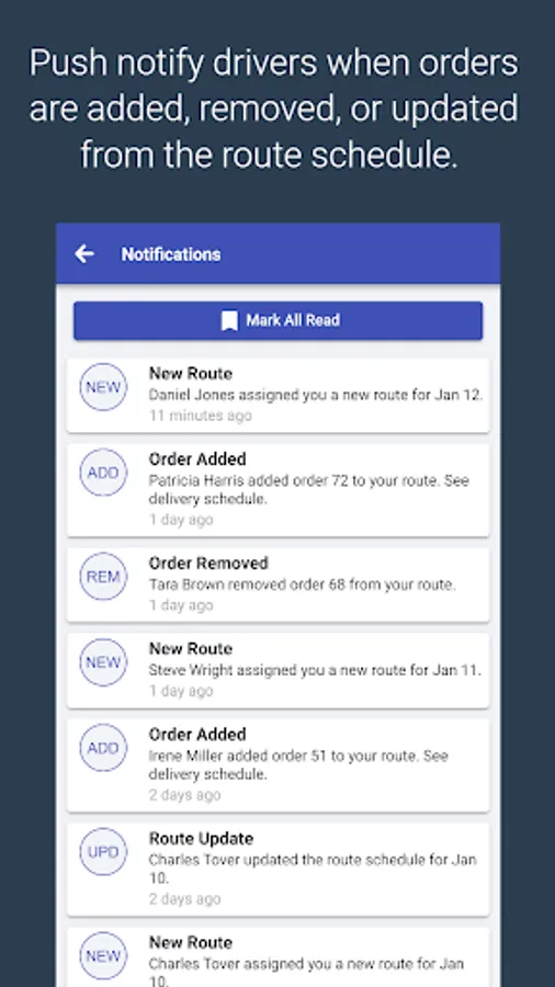 Changes made to the active driver's schedule will automatically notify the driver that there has been an update to your route schedule.