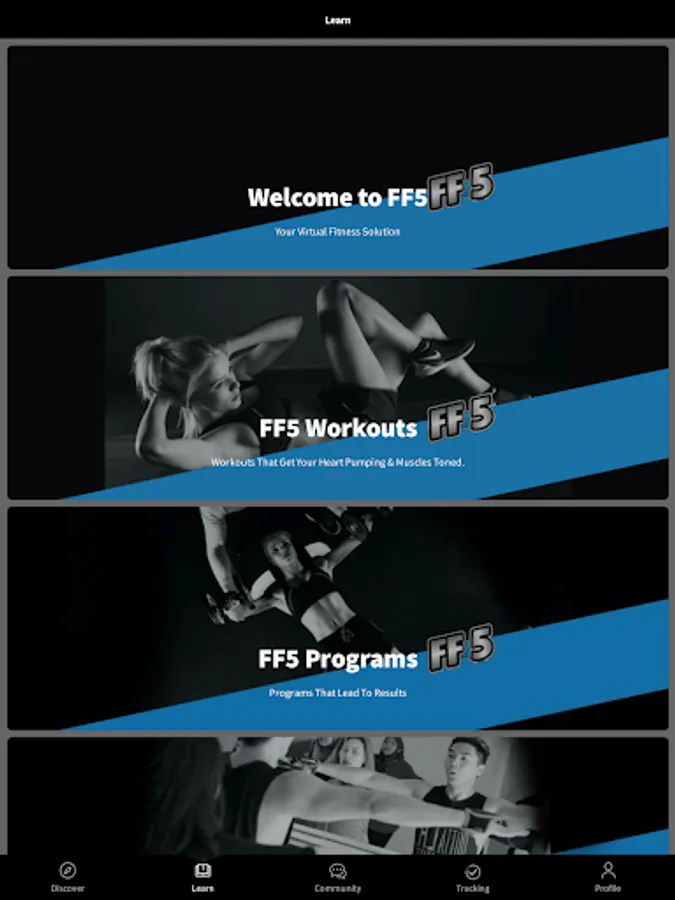 FF5 Programs: Guided workouts created by our Certified Personal Trainers. These programs can be completed at home, in the gym, or outdoors.