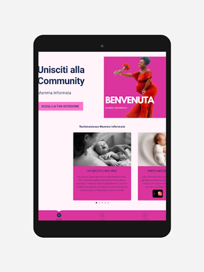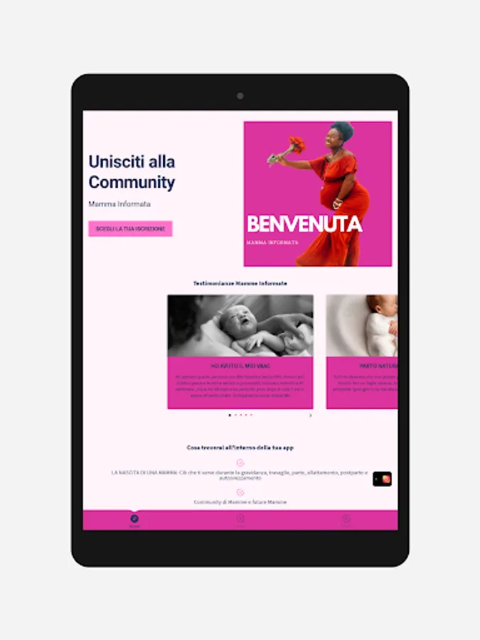 * Community di supporto: L'app include una fantastica community di donne in gravidanza e mamme che condividono esperienze, consigli e supporto reciproco. Le utenti possono partecipare a discussioni, porre domande, condividere foto e connettersi con altre persone che stanno vivendo lo stesso percorso. L'obiettivo è creare un ambiente di sostegno e comprensione, in cui le donne possono trovare ispirazione e incoraggiamento.