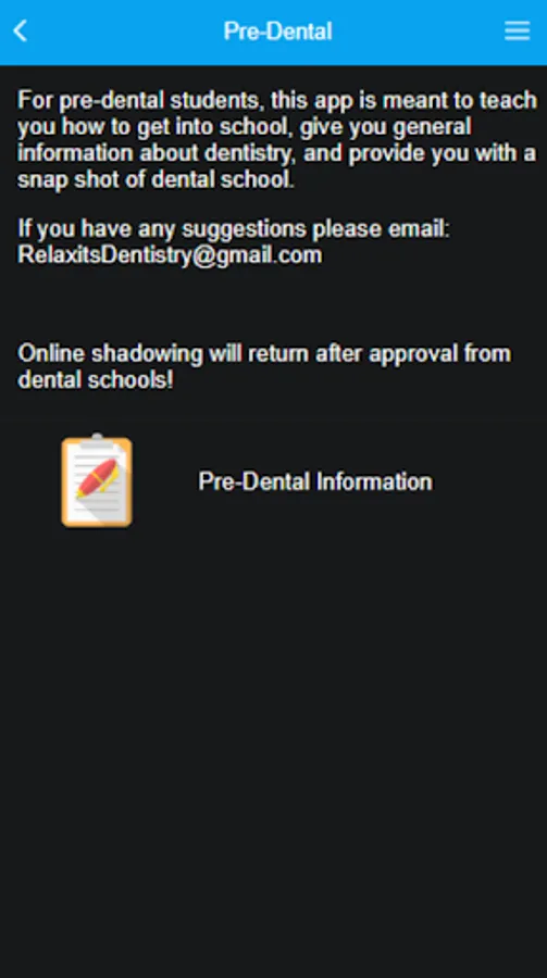 Relax, It’s Dentistry is an app created for pre-dents and dental students to help them learn about dentistry. The app includes information on how to get into dental school, guides on procedures, helpful tips for those about to graduate and much more.