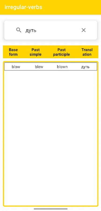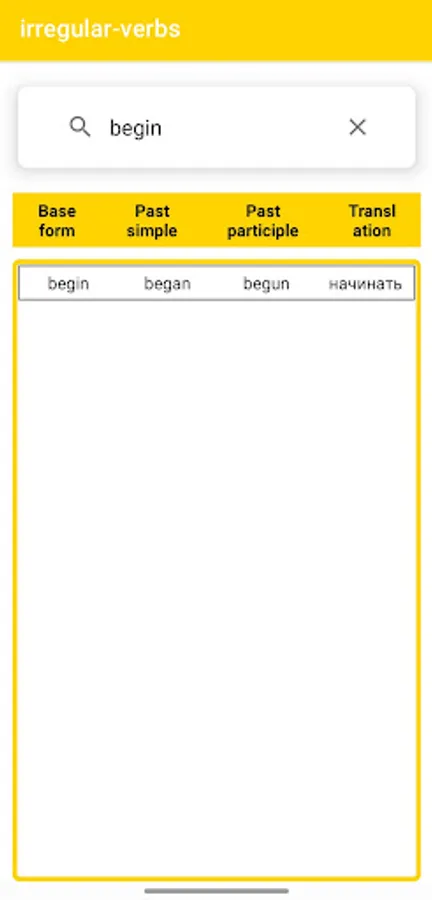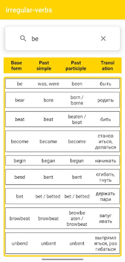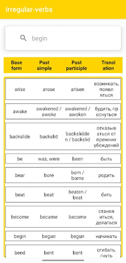 Наше мобильное приложение "Irregular Verbs" - это удобный и быстрый способ изучения неправильных глаголов в английском языке. С помощью нашей таблицы, которая содержит все основные неправильные глаголы, вы сможете легко и быстро усвоить их формы.