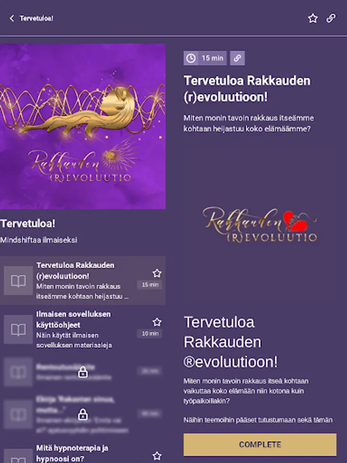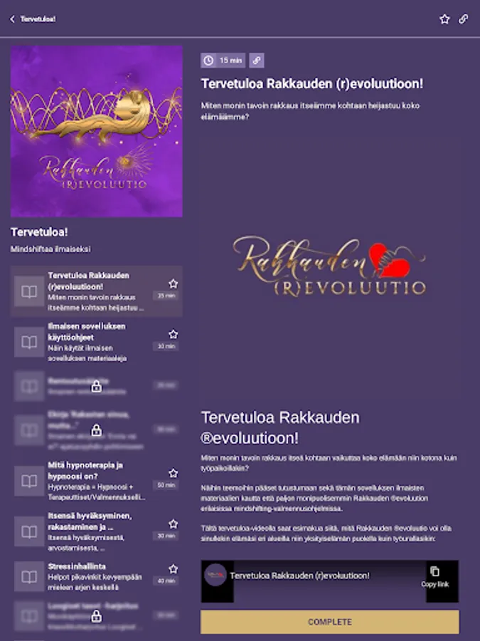 Tämän suomenkielisen sovelluksen on luonut Mindshifting MOMENTUM Oy - Rakkauden (r)evoluution päävalmentaja, Kliininen hypnoterapeutti, NLP Trainer-valmentaja, Coach Kati Niemi tiimeineen.