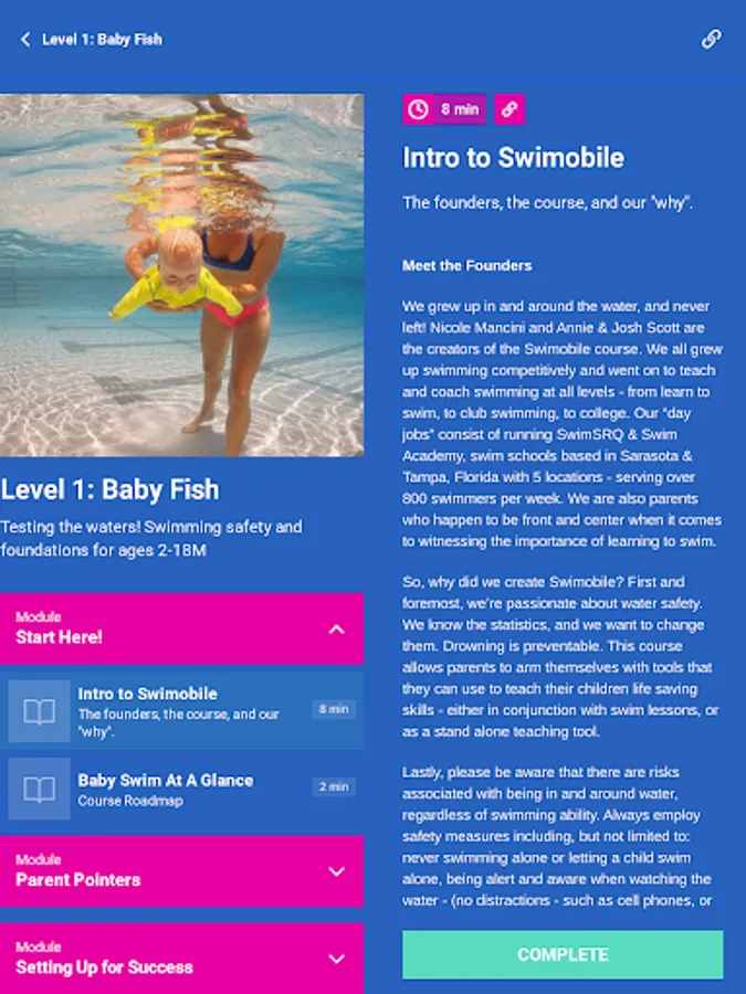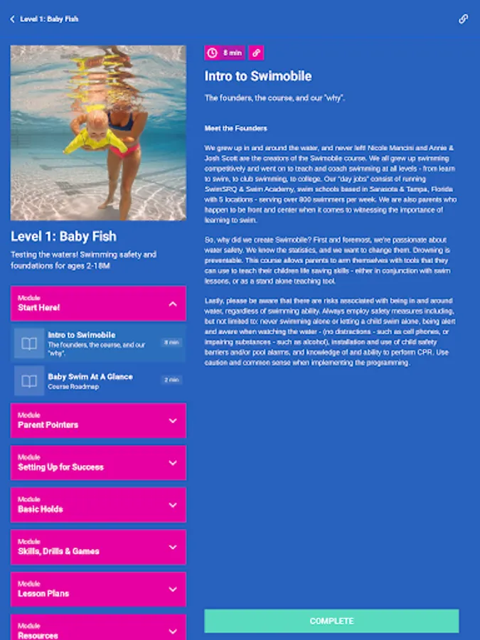 Swimobile provides parents with a learn to swim curriculum that they can use to teach their children to swim. Created by lifelong swimmers and coaches, Swimobile provides video drills and lesson plans that focus on water safety and swimming foundations.