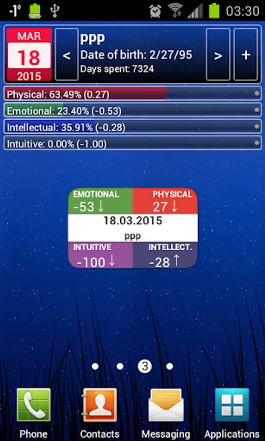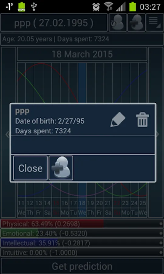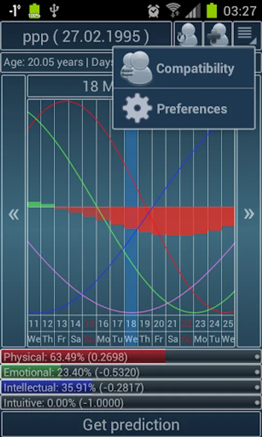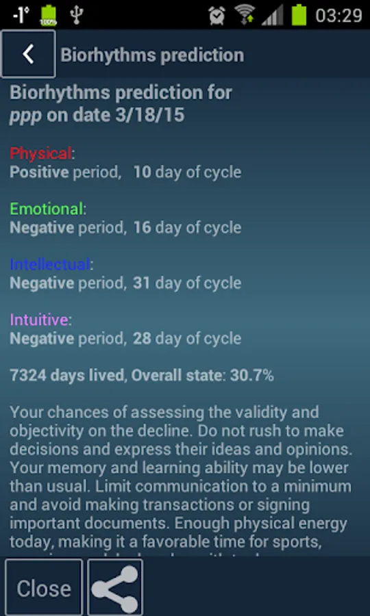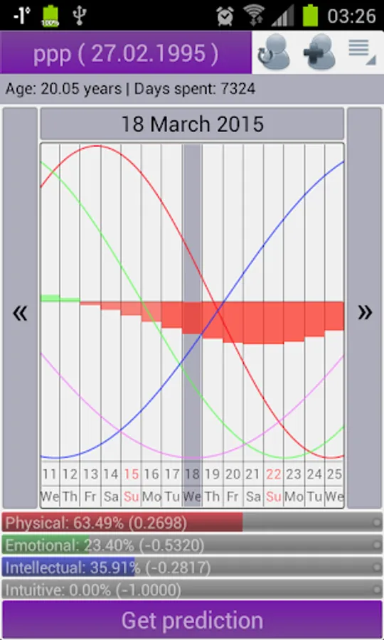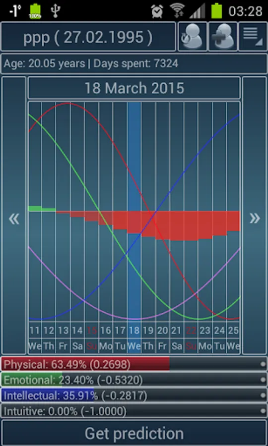 The program calculates personal biorhythms predictions for the selected date for each user, has an easy user interface, allows determine the most dangerous days in the month and makes biorhythm calculations with high accuracy.