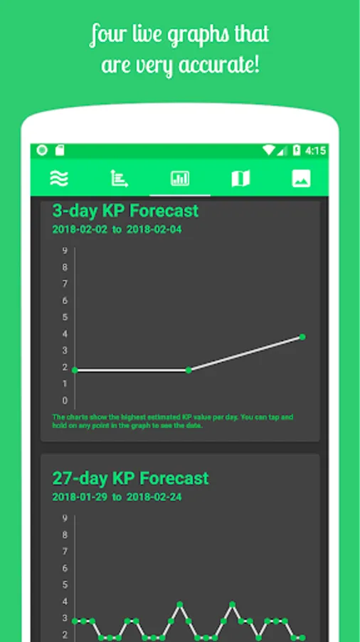 Unleash the power of easy to read graphs to see a forecast of realistic and potential KP values over the next few hours. Always know when the best days and times will be to see the Northern Lights & Southern Lights. Leverage the power of 3-day and 27-day KP forecasts.