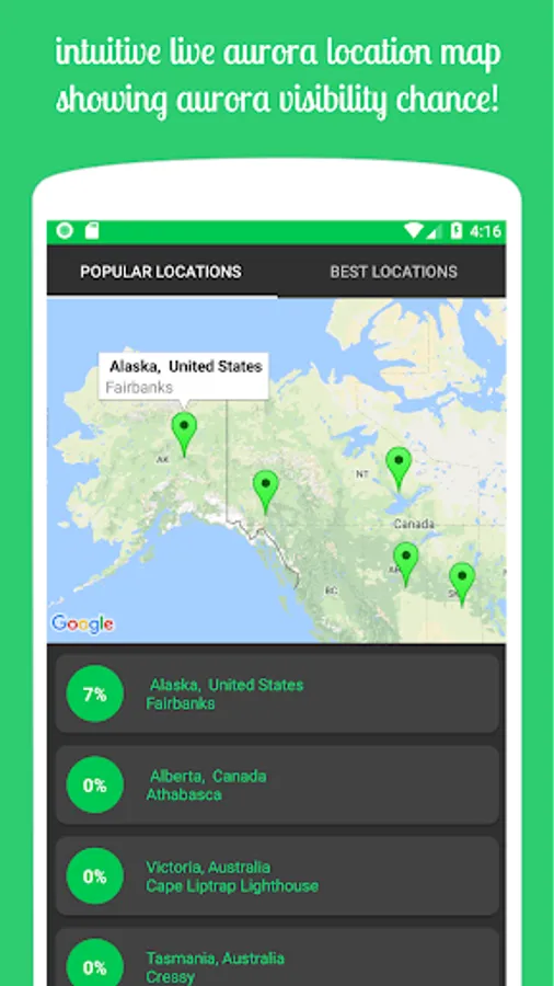 *Some features above are not available in the free version and may require an additional in-app purchase to AuroraCast Pro. AuroraCast Pro is a one time purchase of $5.99 USD and helps us to keep this great app running. The northern lights are beautiful and fantastic to witness.