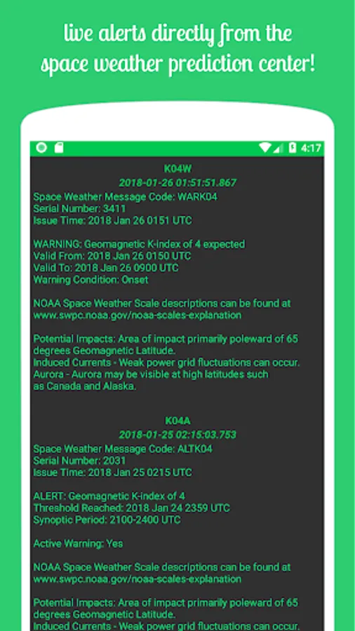 Configure the app to send you alerts for when the aurora is visible at your location, and/or when global geomagnetic activity is high! Never miss the aurora again!