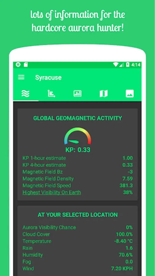 Only the best information and data for the hardcore aurora borealis hunter. Get a fast-loading and accurate KP value indicator to know when the aurora borealis will be active. AuroraCast also has live magnetic field info such as Bz, Density, and Speed!