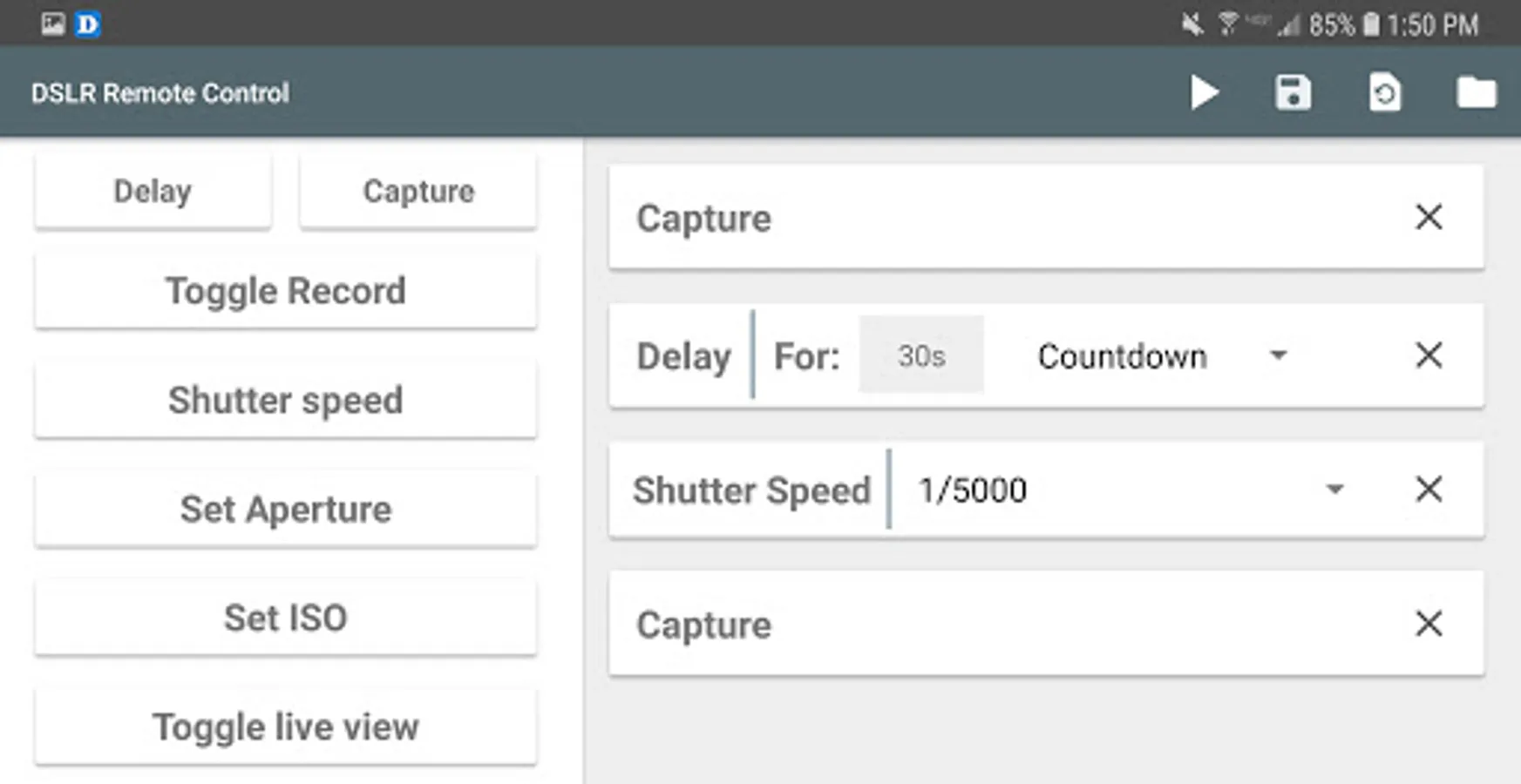 • Script builder. Create scripts to automatically control your camera! Create and save multiple scripts, re-edit them, and export them in .json format!