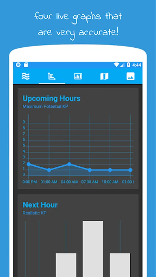 Unleash the power of easy to read graphs to see a forecast of realistic and potential KP values over the next few hours, as well as 3-day and 27-day KP forecast.