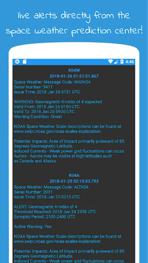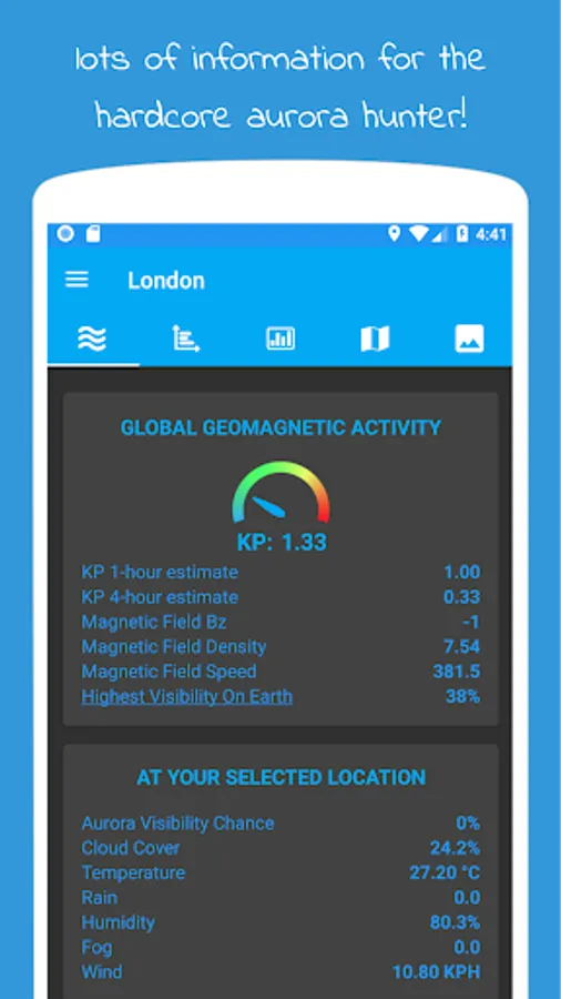 Configure the app to send you alerts for when the aurora is visible at your location, and/or when global geomagnetic activity is high! Never miss the aurora again!