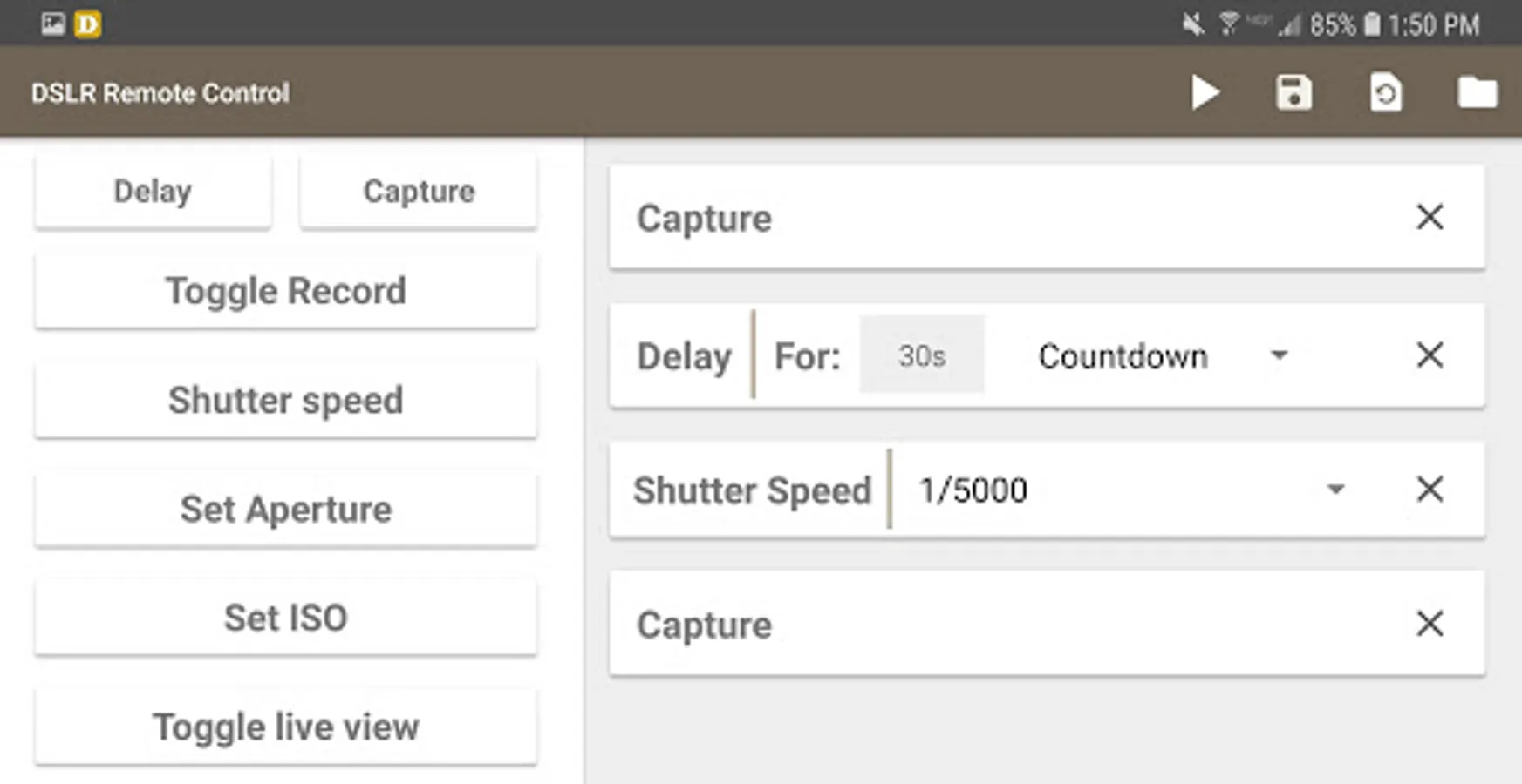 In the pro version, you can create scripts to automatically control your camera! Create and save multiple scripts, re-edit them, and export them in .json format!