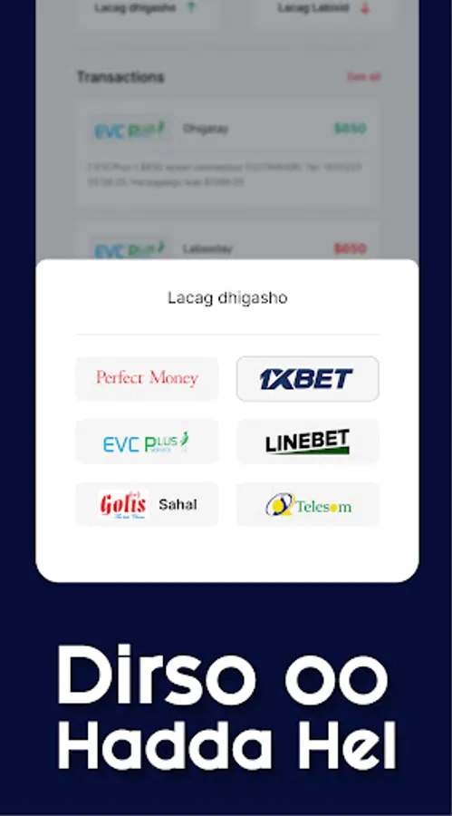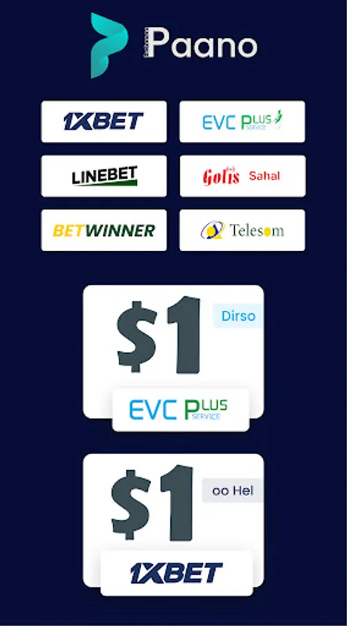 EvcPlus, Jeeb, E-Dahab, E-Sahal, Golis, 1Xbet, Linbet, Betwinner iyo Perfect Money