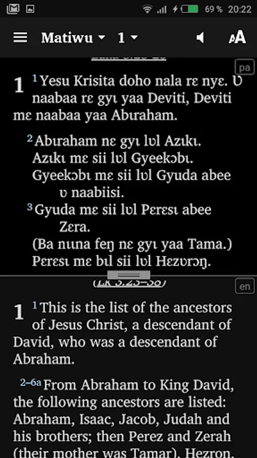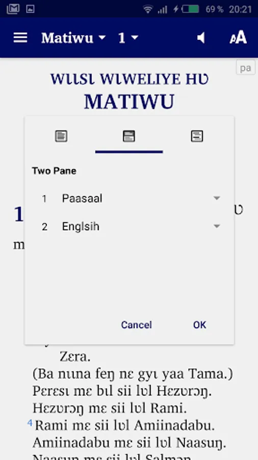 - "two panes" to display the Paasaal at the top and the English version at the bottom
