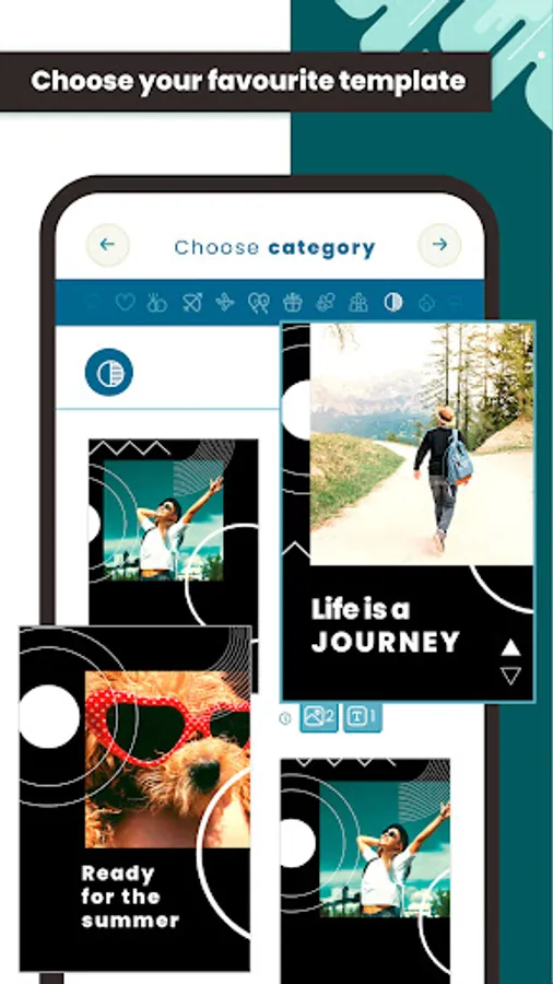 Our animated story maker app offers you 12 different categories with vintage frames, original templates, text styles, backgrounds and free animations. Dozens of ready-to-post animated story templates including film, travel, babies, vintage, classic and more. New collections continually added to perfectly fit every occasion.