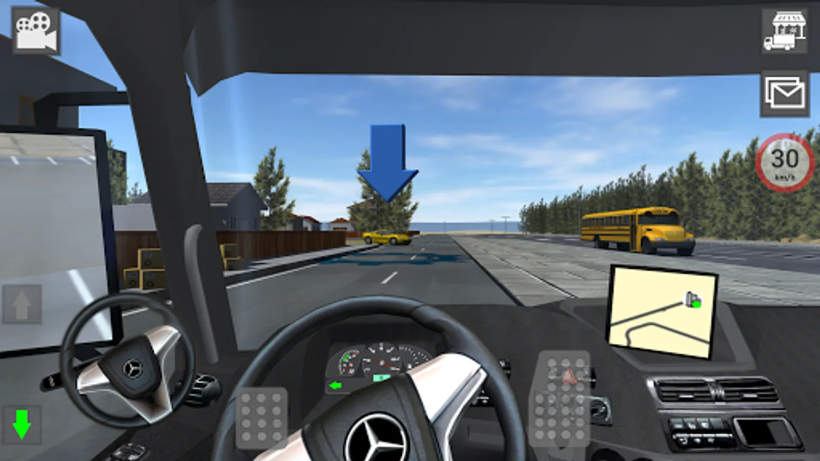In the upper right you will find the Shop button that will present the Mercedes-Benz truck models available in the simulator.