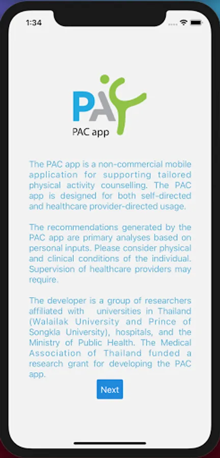 The PAC app is a non-commercial mobile application for supporting tailored physical activity counselling. The PAC app is designed for both self-directed and healthcare provider-directed usage.