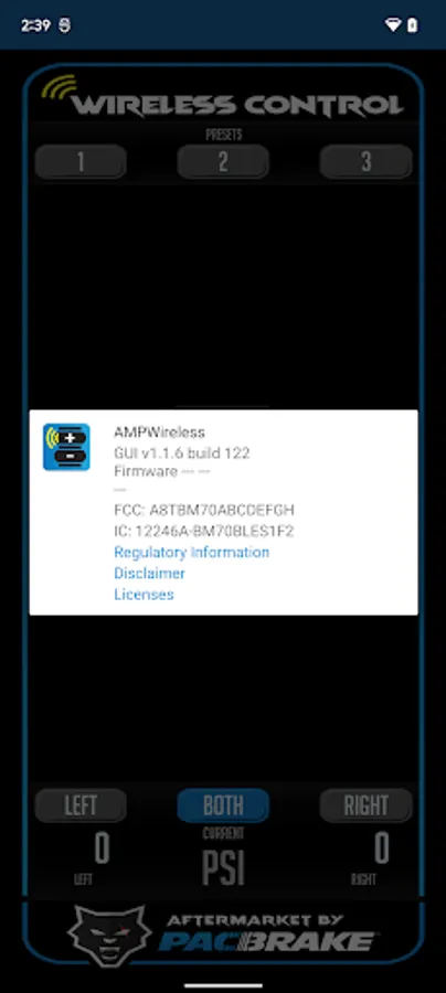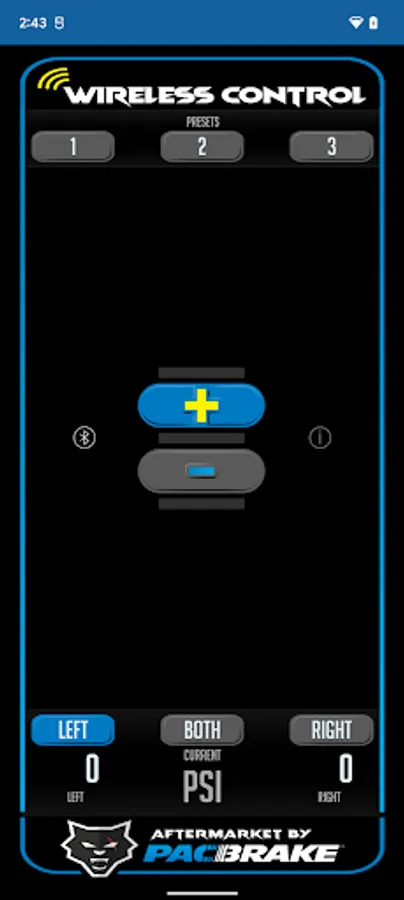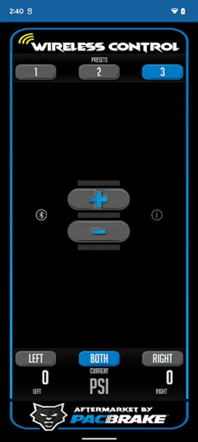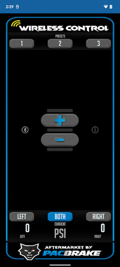 This easy to use app reads real time pressure feedback within each air spring. Additionally, it has three buttons that allow you to save presets so you can quickly achieve your desired air spring pressure. AMP Wireless Controls app works with Pacbrake's AMP Wireless Air Spring Controls (Kit number HP10316).